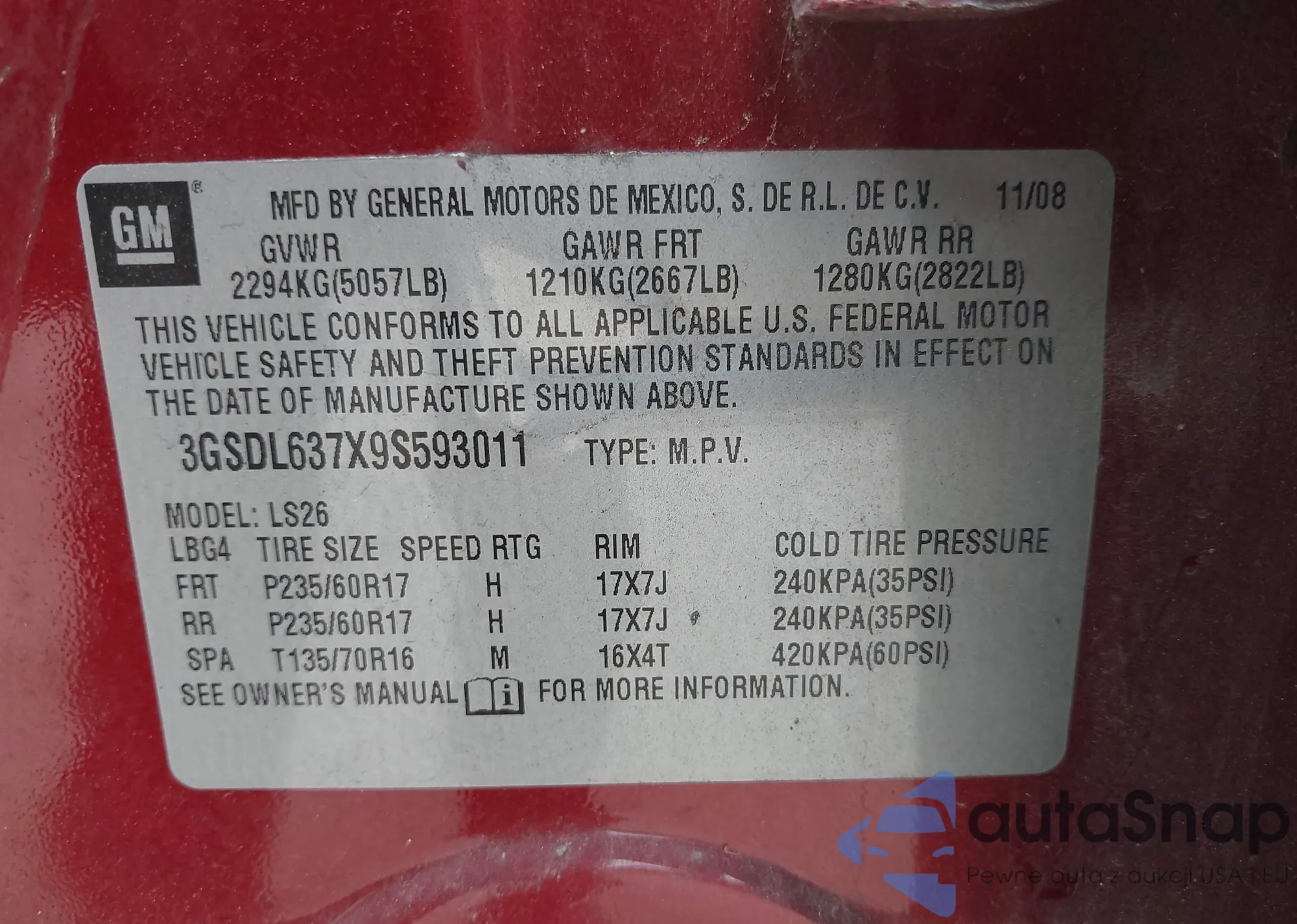 VIN: 3GSDL637X9S593011