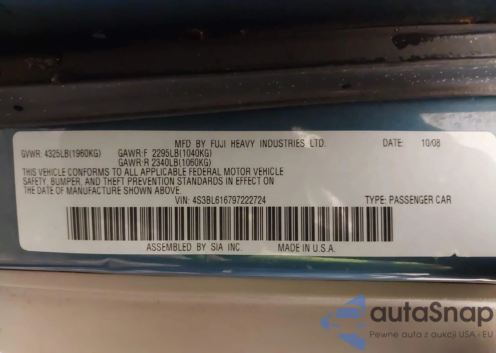 • VIN: 4S3BL616797222724