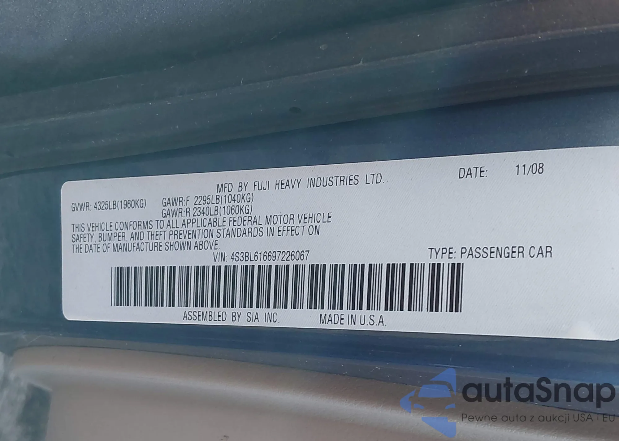 The car Subaru Legacy 2009 (VIN 4S3BL616697226067) has documents that prevent registration. Export and registration may be difficult. Contact AutaSnap experts to find alternatives.