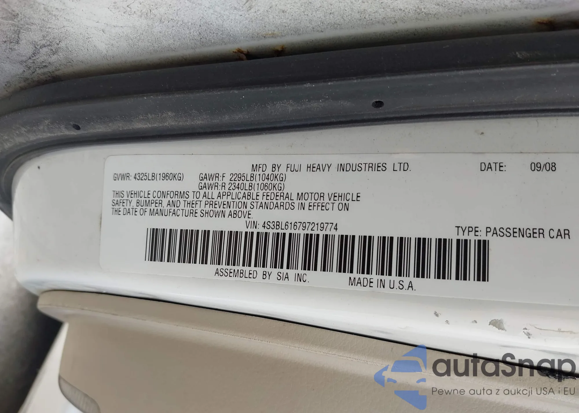 The car Subaru Legacy 2009 (VIN 4S3BL616797219774) has not been auctioned before. The documents are clean, and the mileage matches or is below the market average. Sold by an insurance company – we recommend purchase. Delivery to the port will take approx. 6–8 weeks.