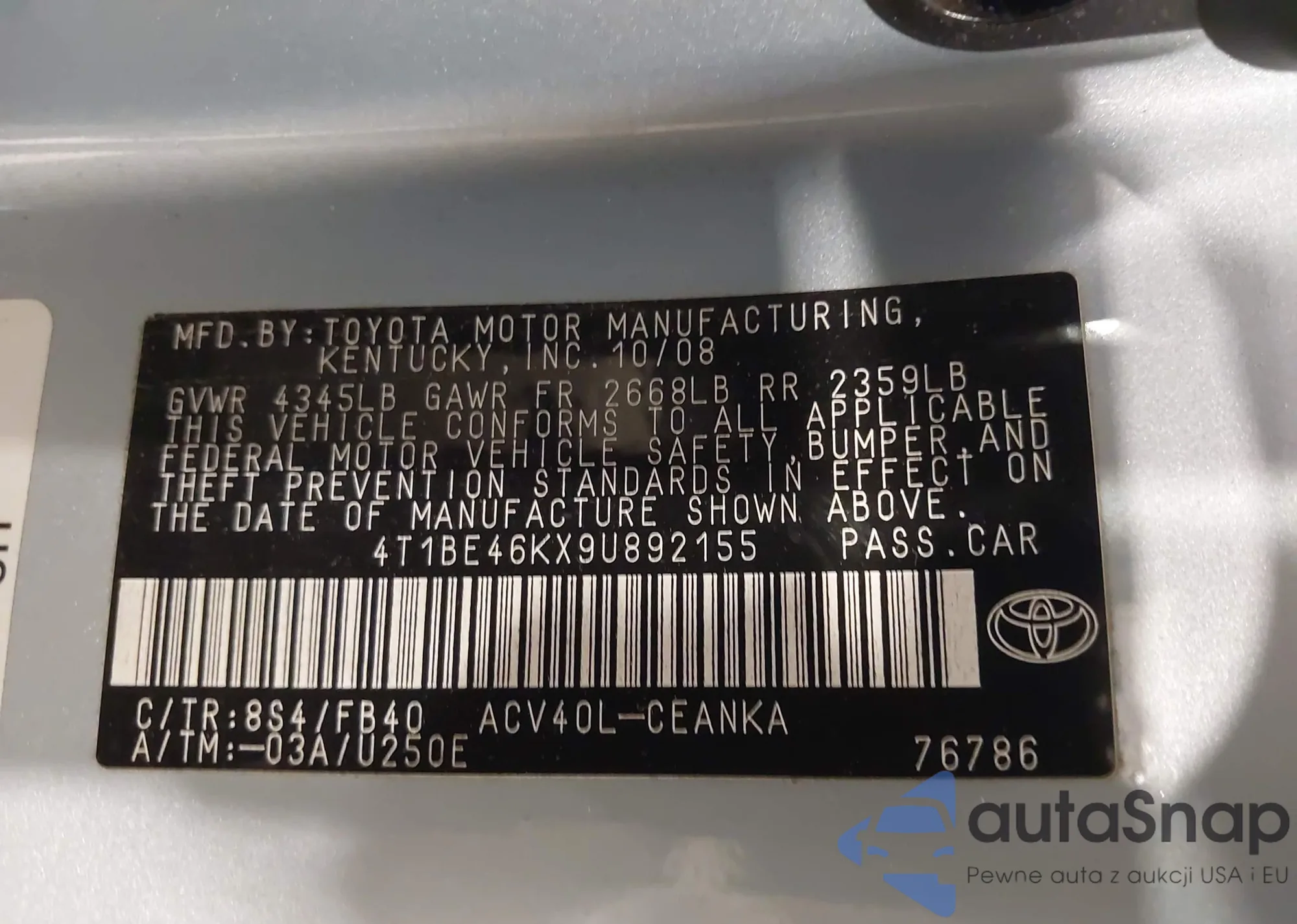 VIN: 4T1BE46KX9U892155