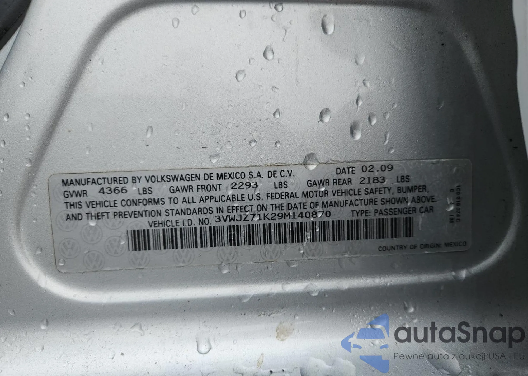 VIN: 3VWJZ71K29M140870