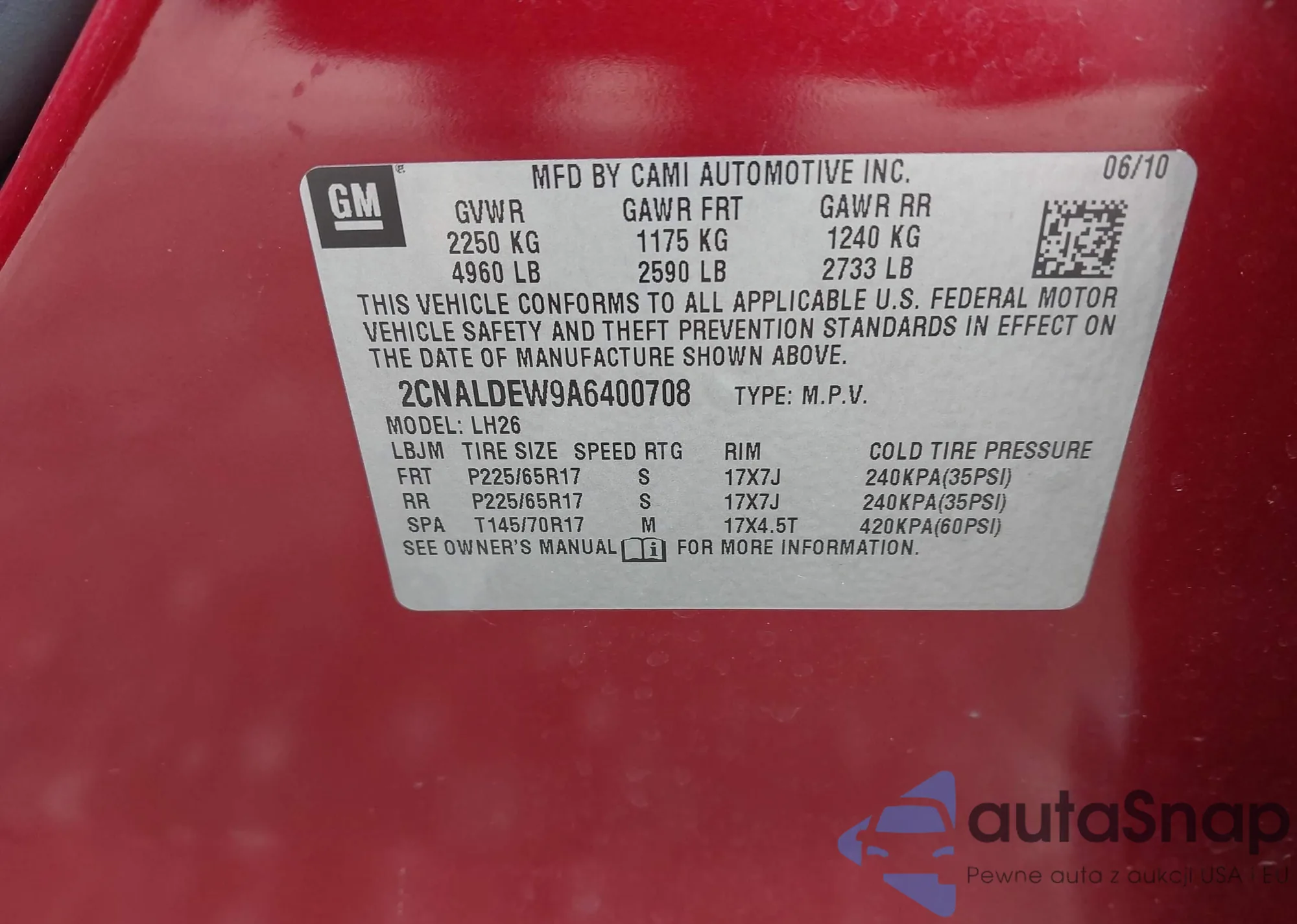 The car Chevrolet Equinox 2010 (VIN 2CNALDEW9A6400708) has not been auctioned before. The documents are clean, and the mileage matches or is below the market average. Sold by an insurance company – we recommend purchase. Delivery to the port will take approx. 6–8 weeks.