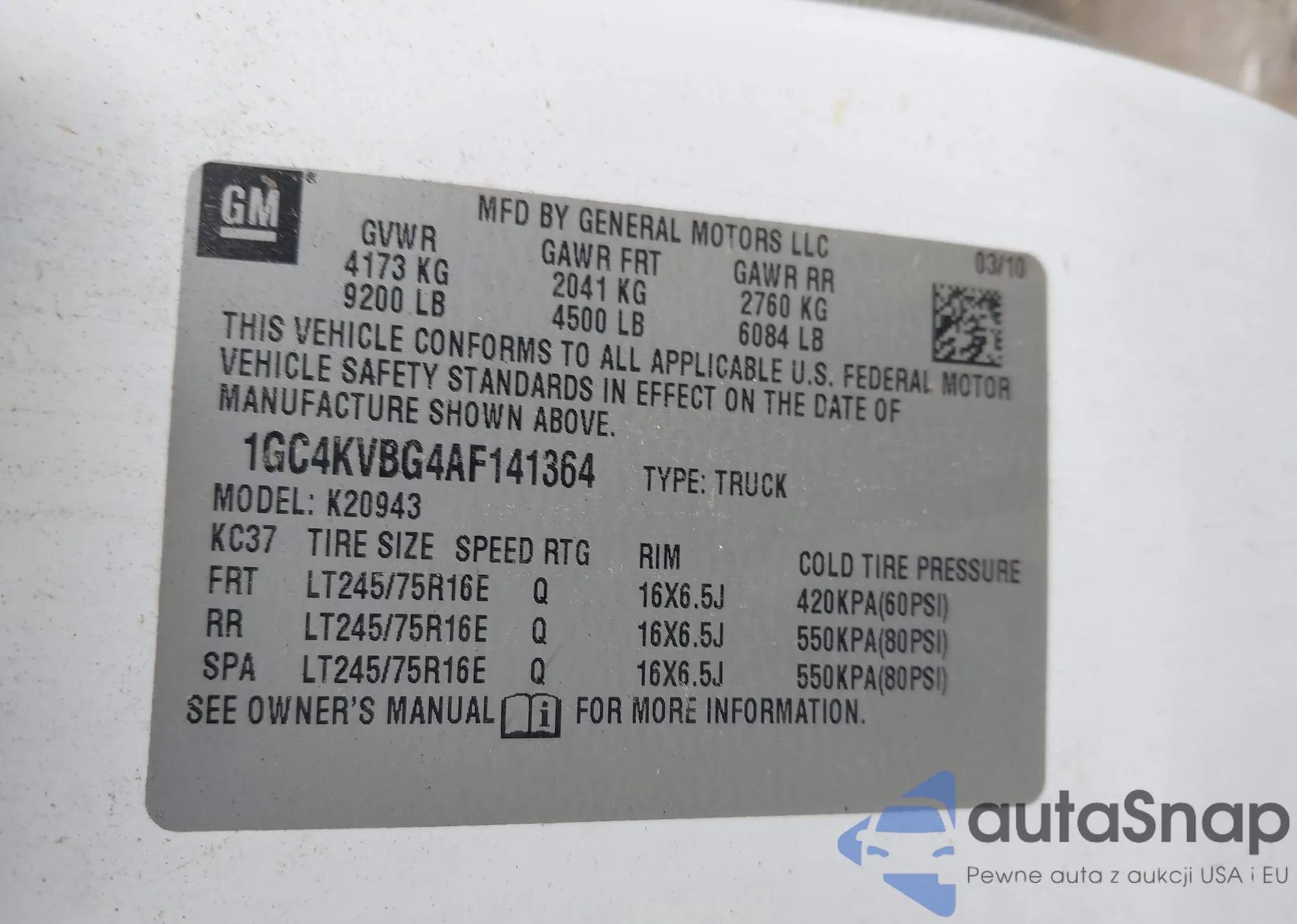VIN: 1GC4KVBG4AF141364