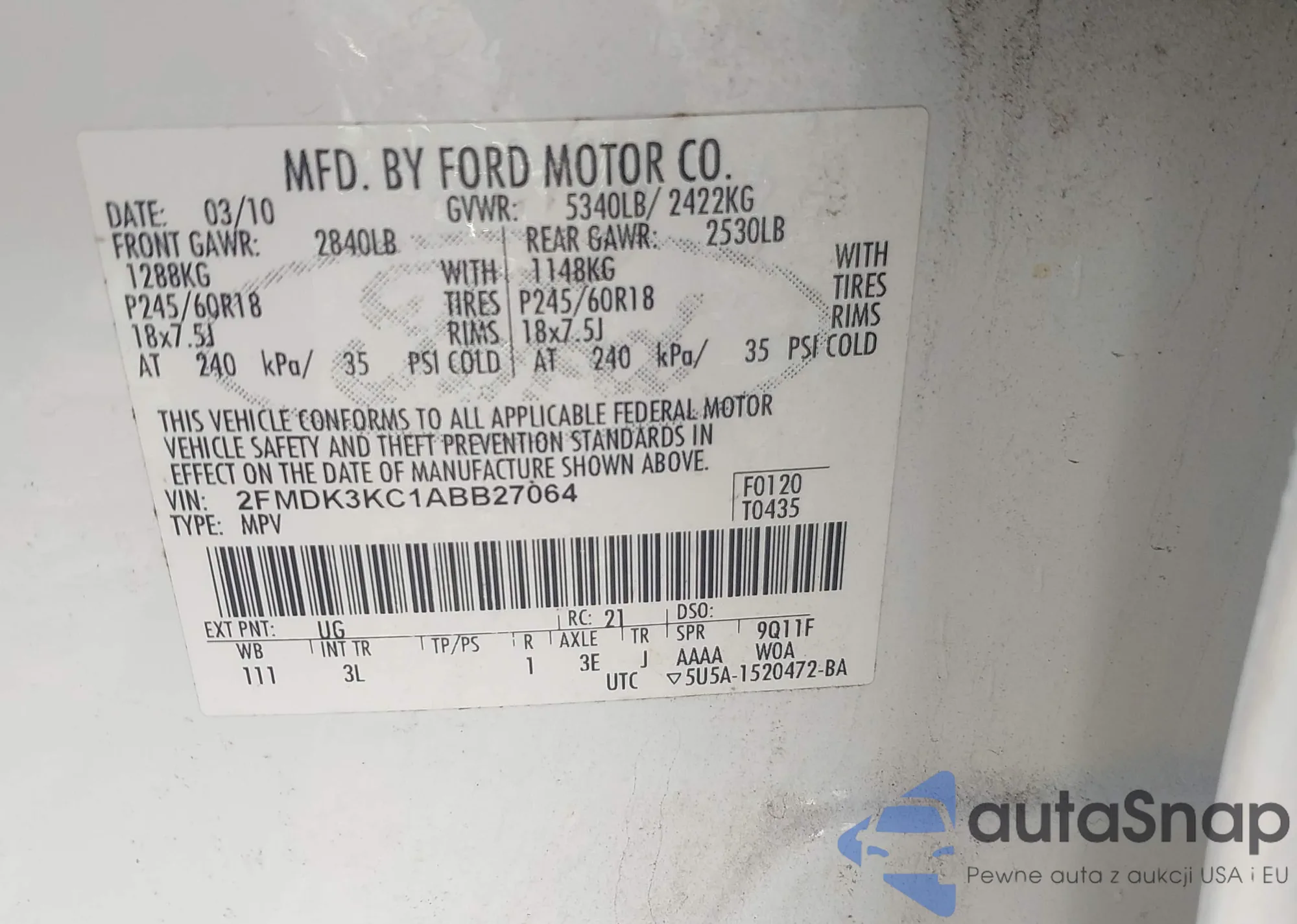 • VIN: 2FMDK3KC1ABB27064