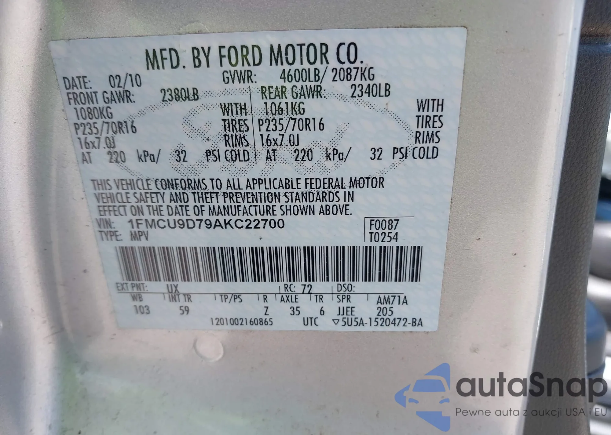 VIN: 1FMCU9D79AKC22700