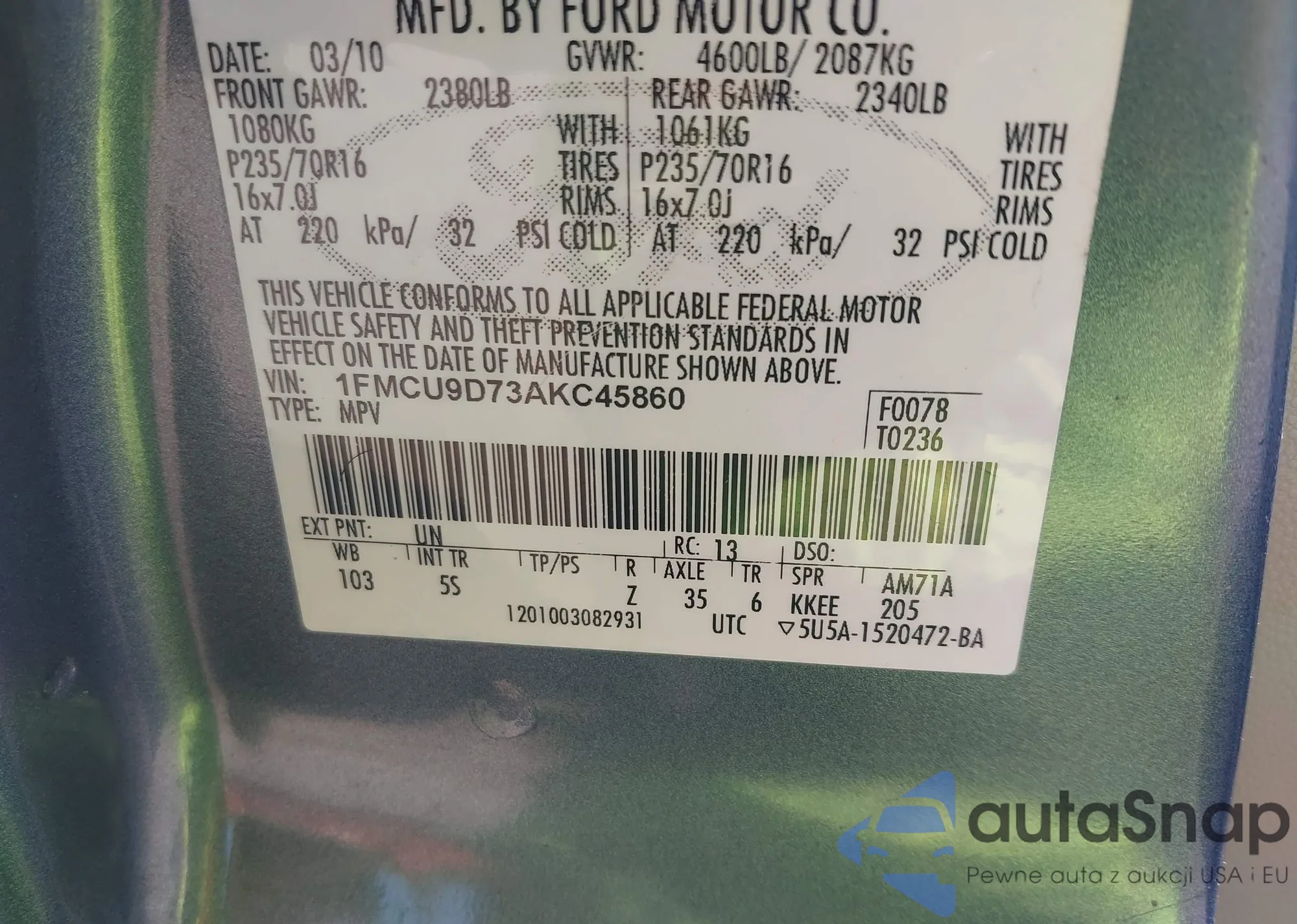 VIN: 1FMCU9D73AKC45860