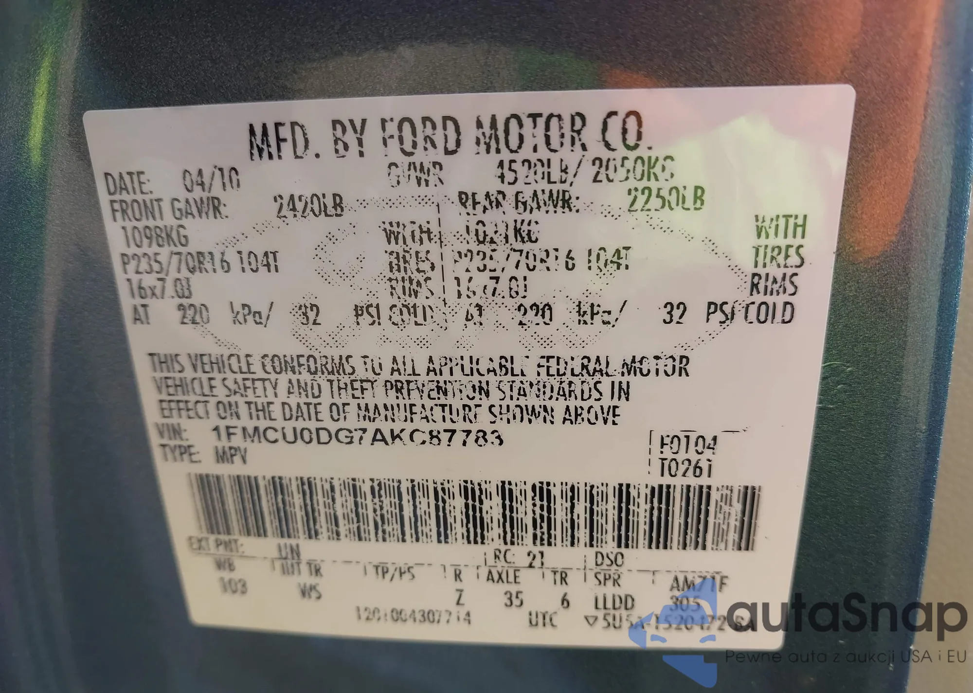 The car Ford Escape 2010 (VIN 1FMCU0DG7AKC87783) has not been auctioned before. The documents are clean, and the mileage matches or is below the market average. Sold by an insurance company – we recommend purchase. Delivery to the port will take approx. 6–8 weeks.