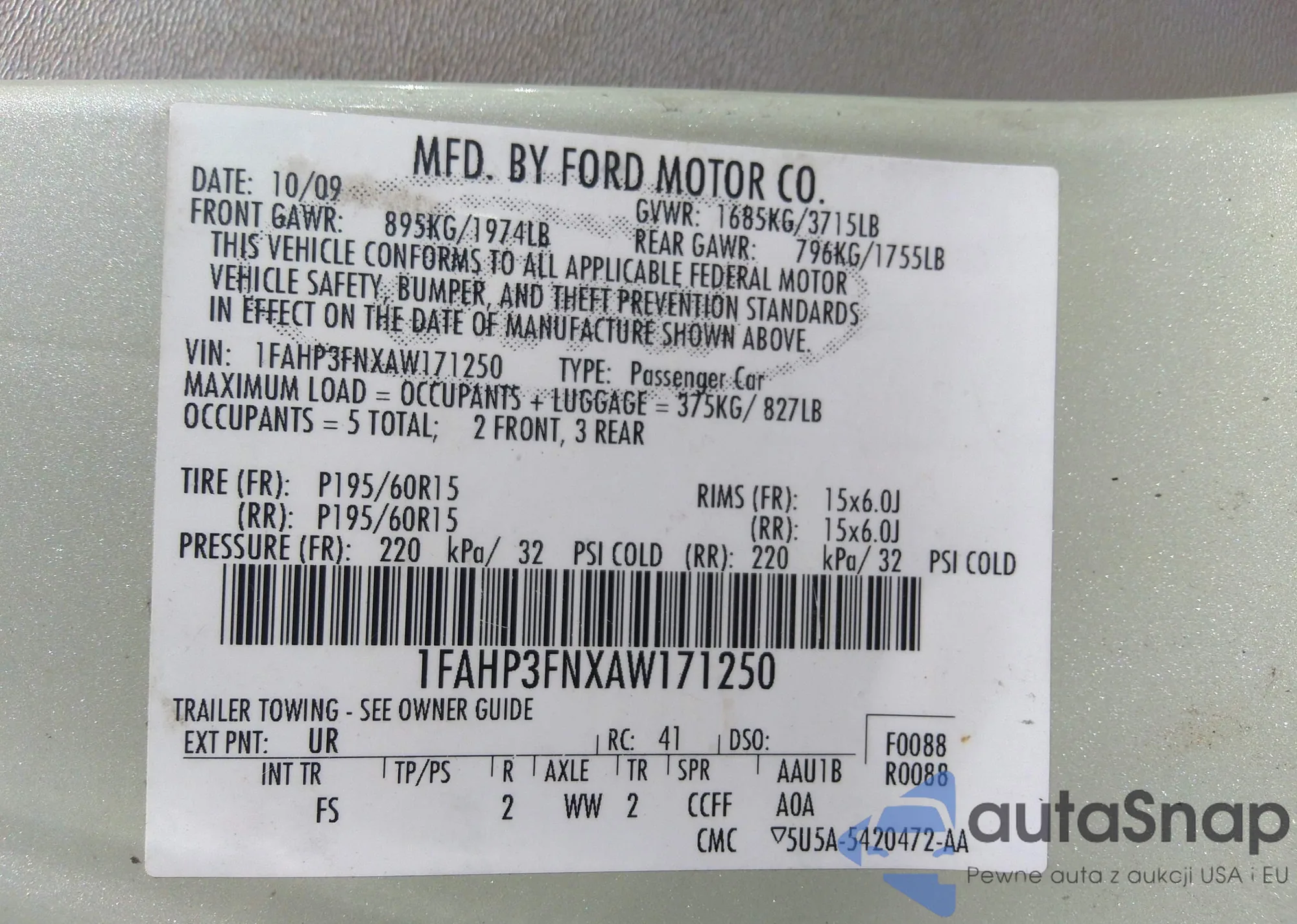 • VIN: 1FAHP3FNXAW171250