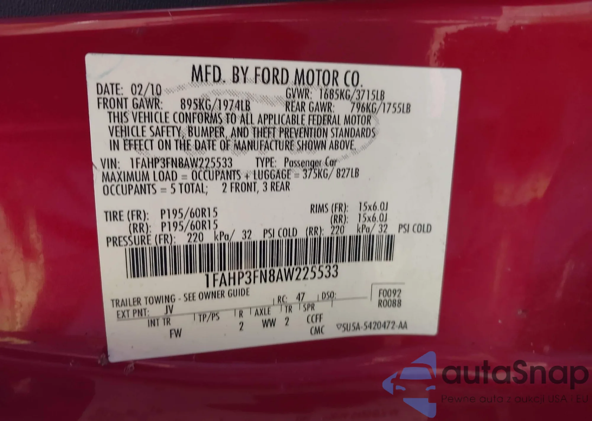 VIN: 1FAHP3FN8AW225533