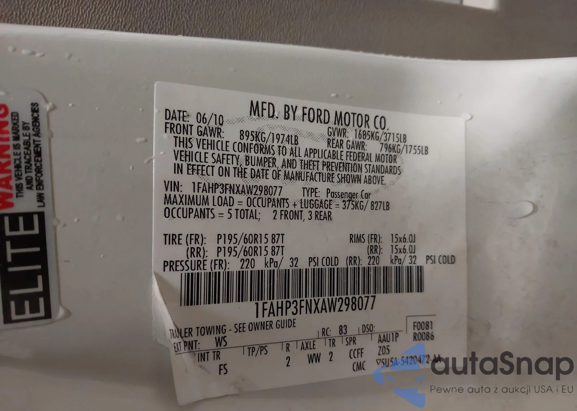 VIN: 1FAHP3FNXAW298077