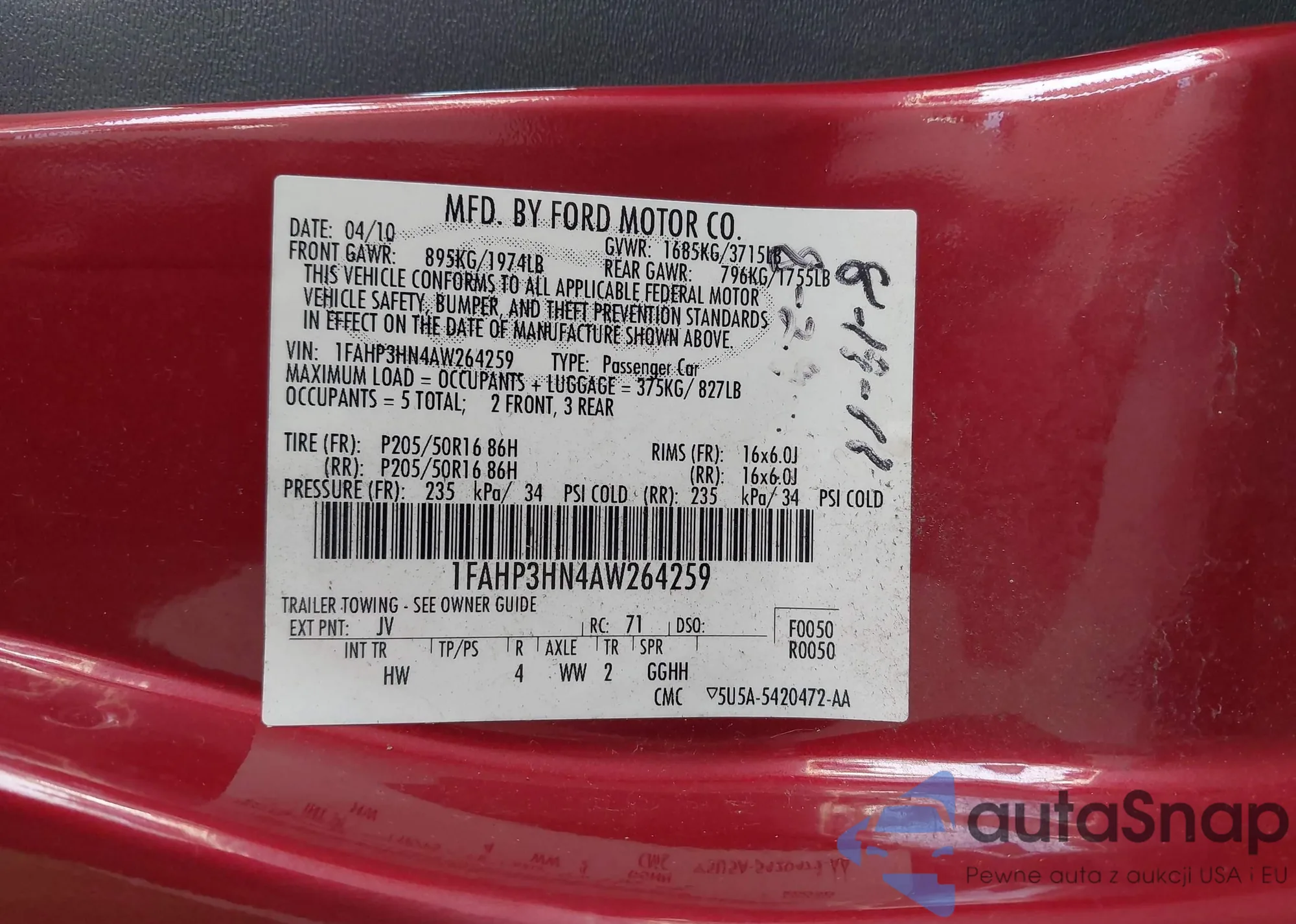 VIN: 1FAHP3HN4AW264259