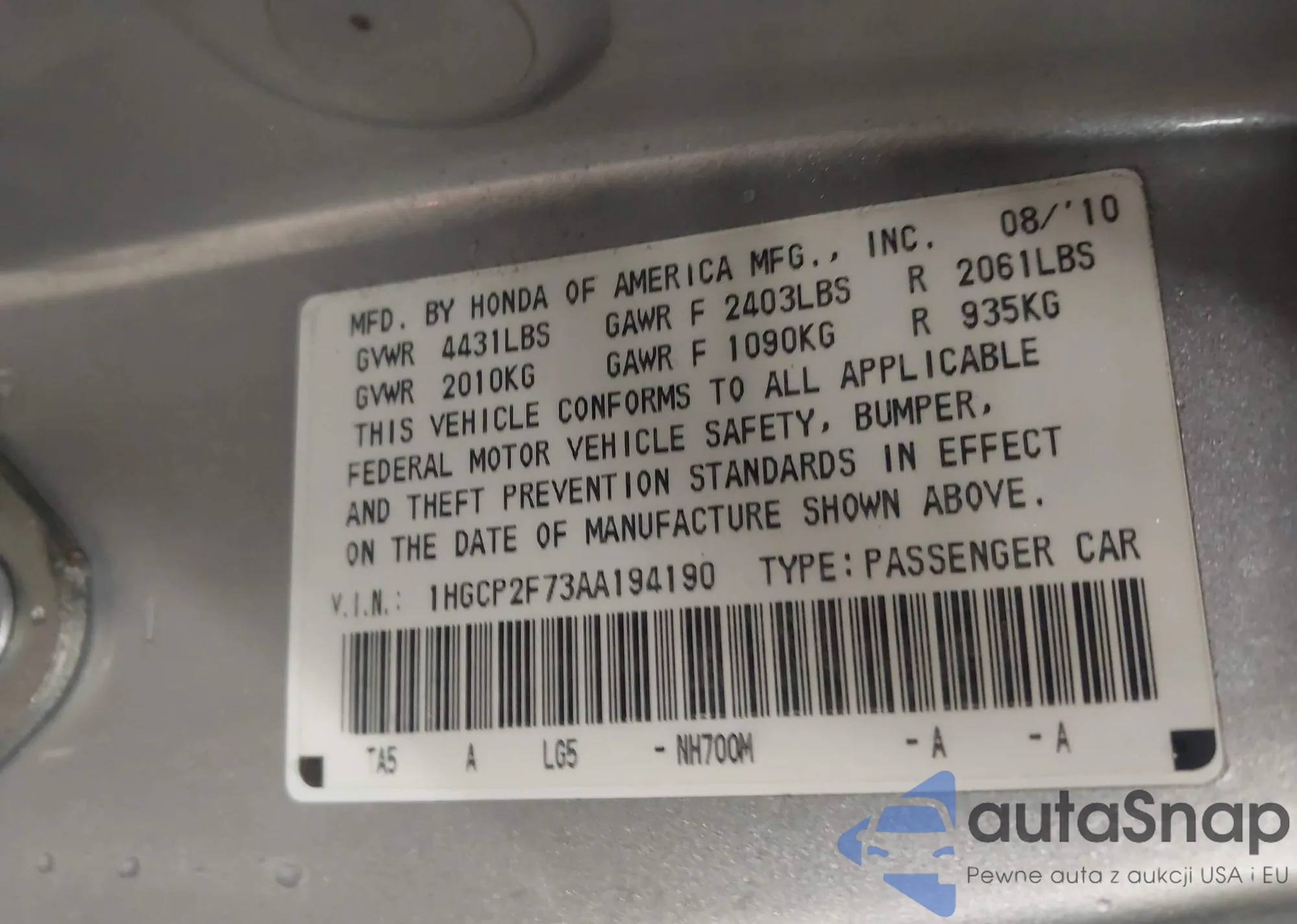 VIN: 1HGCP2F73AA194190