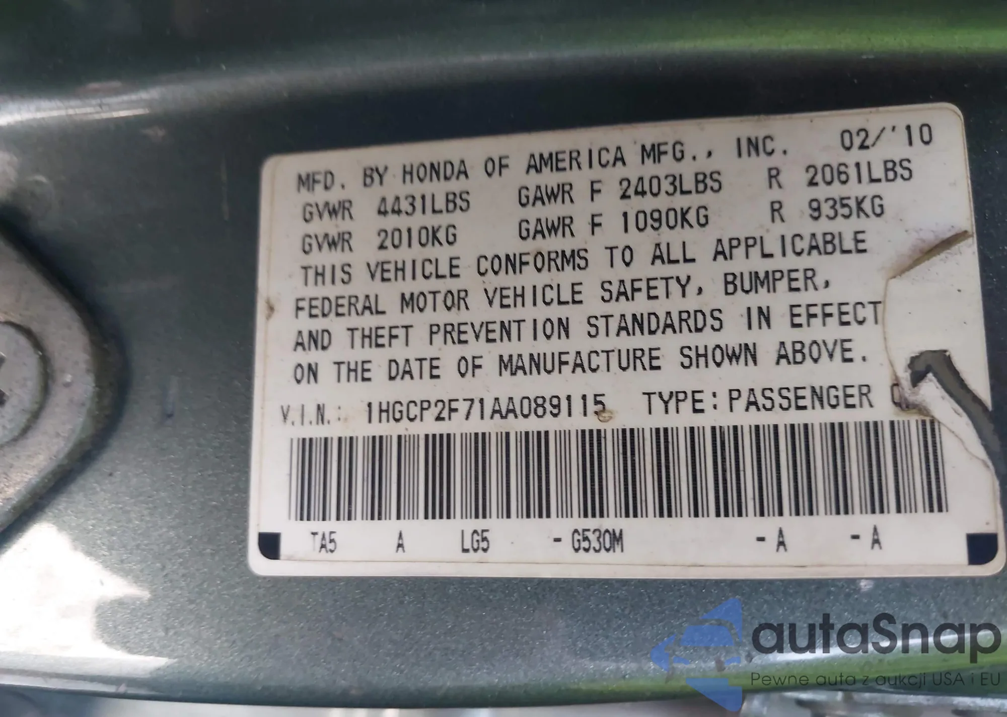 VIN: 1HGCP2F71AA089115