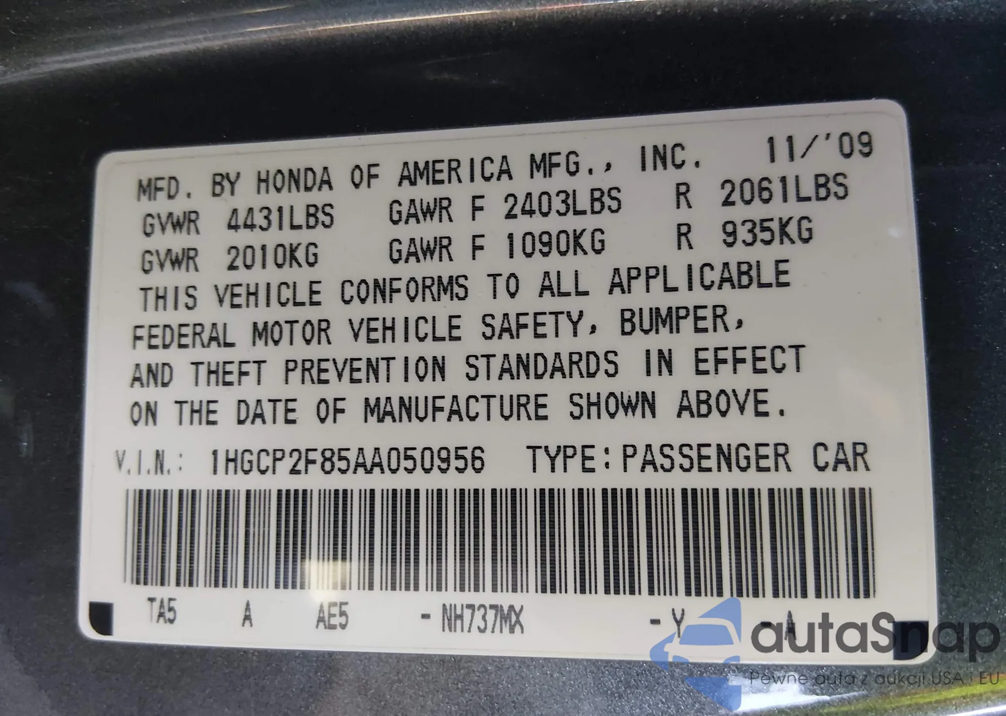 The car Honda Accord 2010 (VIN 1HGCP2F85AA050956) is sold by an unverified seller. We recommend checking the Carfax report and confirming registration possibilities before purchase.
