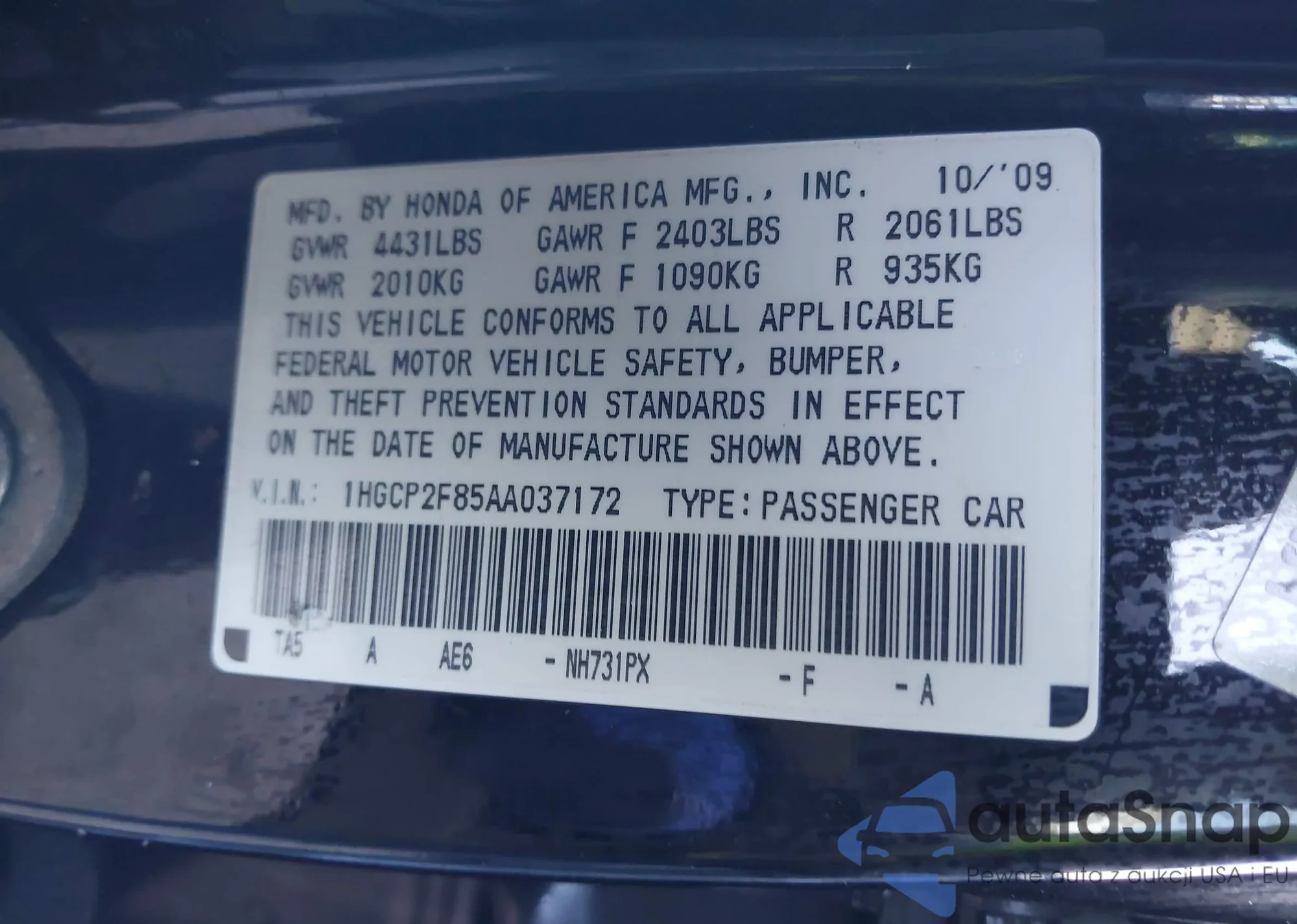 VIN: 1HGCP2F85AA037172