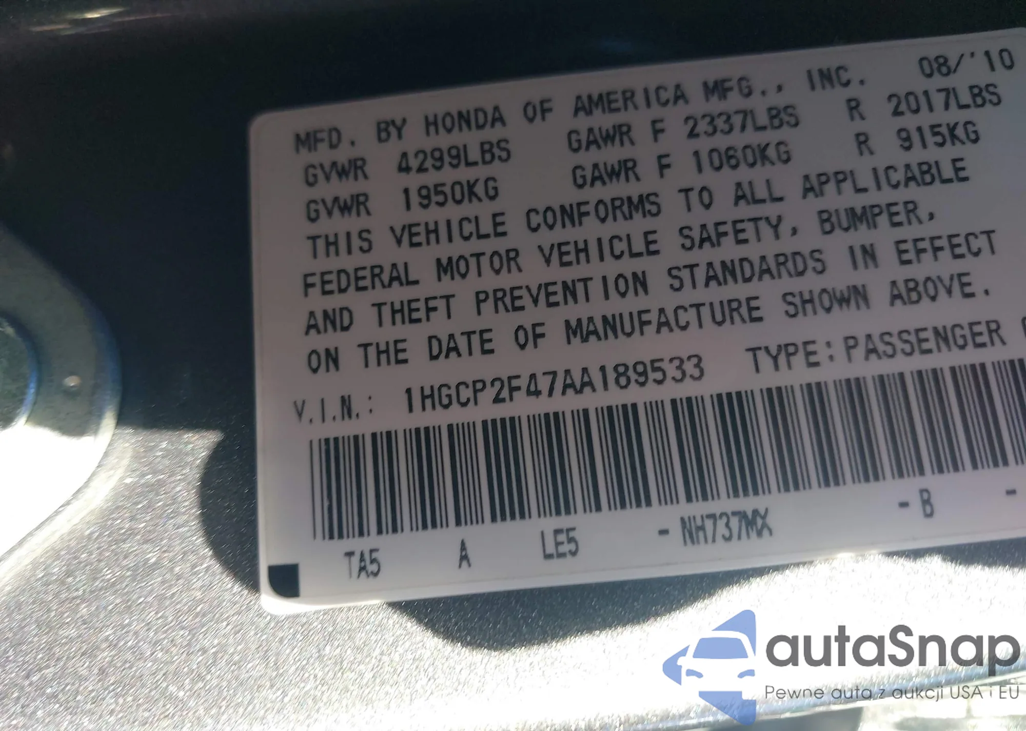 VIN: 1HGCP2F47AA189533
