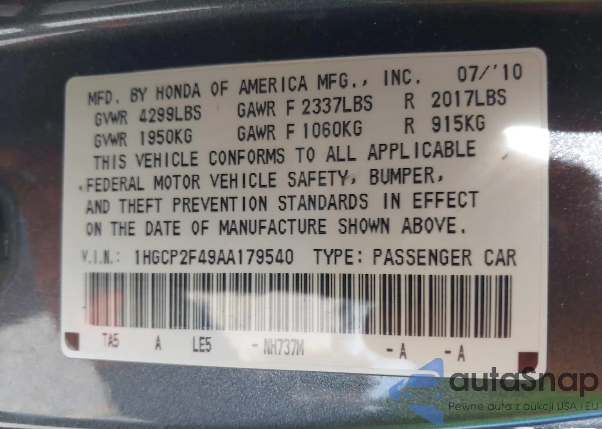 VIN: 1HGCP2F49AA179540