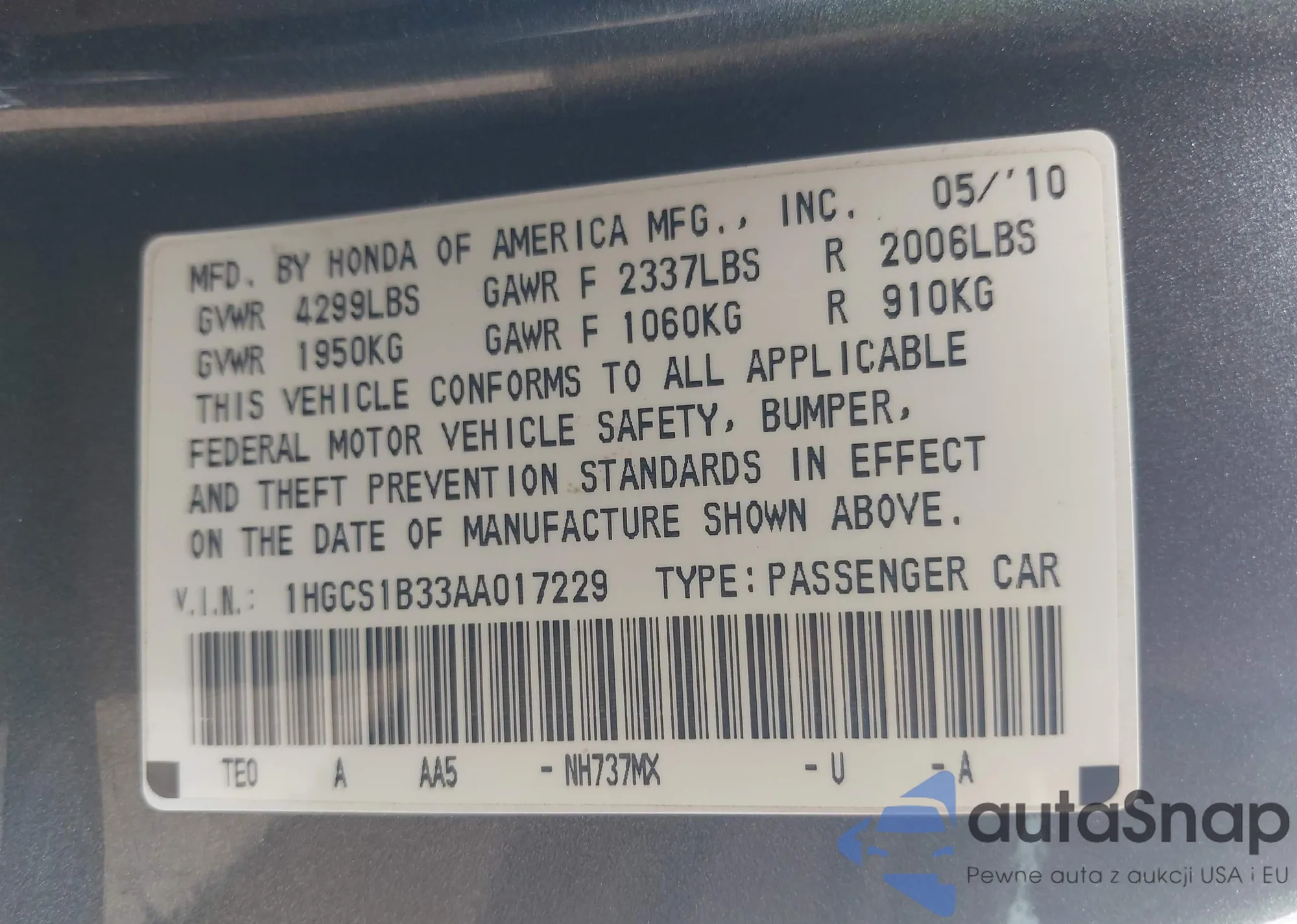VIN: 1HGCS1B33AA017229