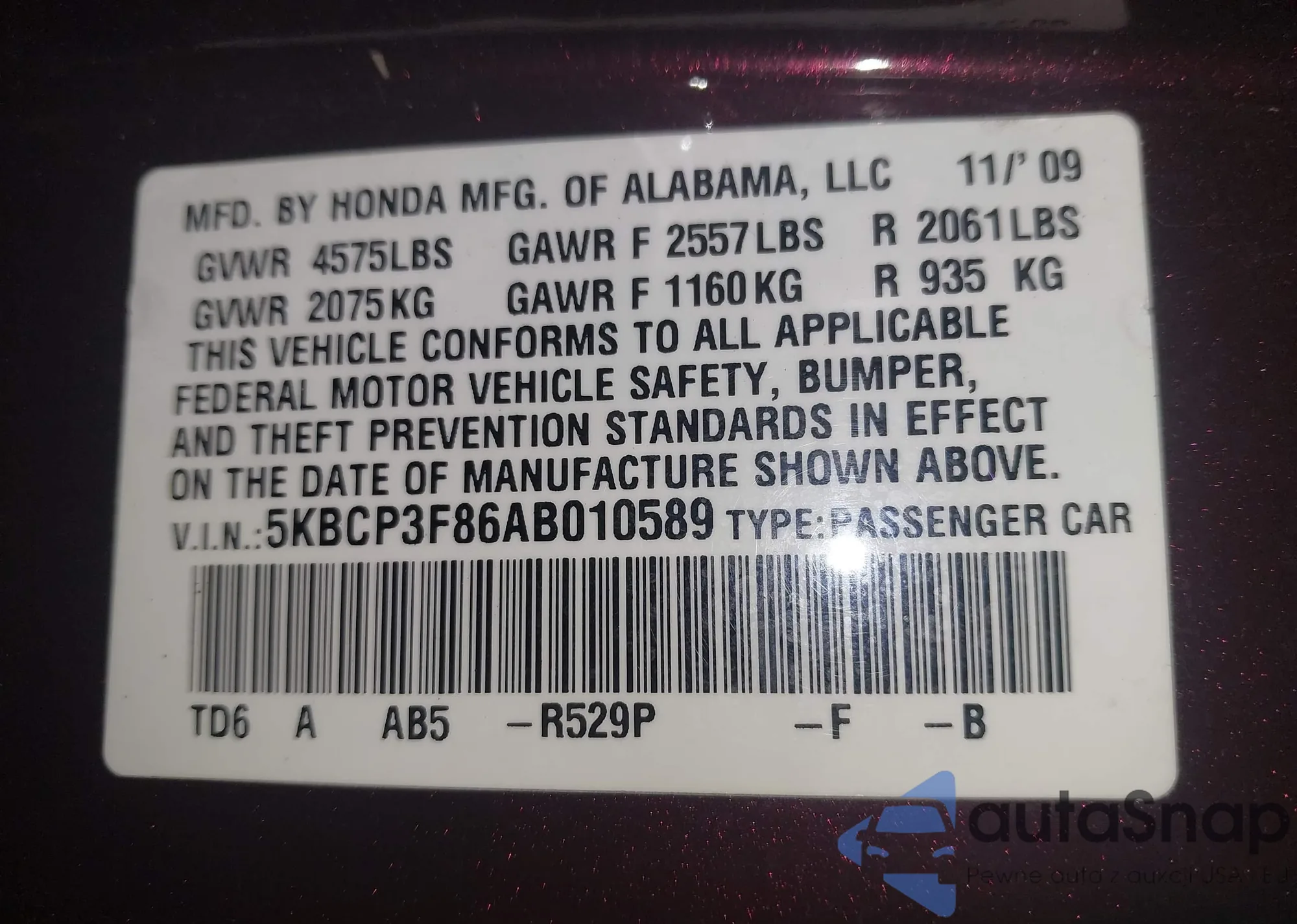 The car Honda Accord 2010 (VIN 5KBCP3F86AB010589) is sold by an unverified seller. We recommend checking the Carfax report and confirming registration possibilities before purchase.