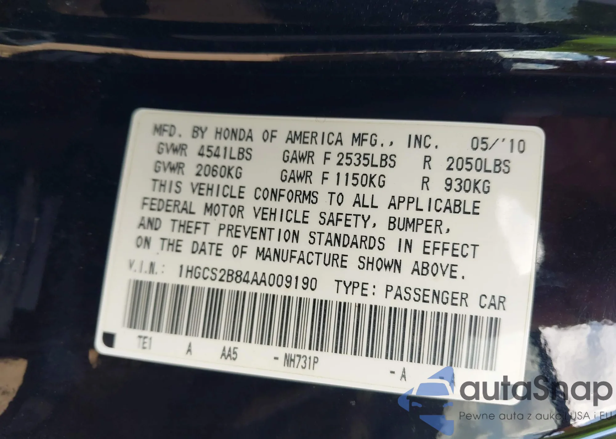 The car Honda Accord 2010 (VIN 1HGCS2B84A1009190) has not been auctioned before. The documents are clean, and the mileage matches or is below the market average. Sold by an insurance company – we recommend purchase. Delivery to the port will take approx. 6–8 weeks.
