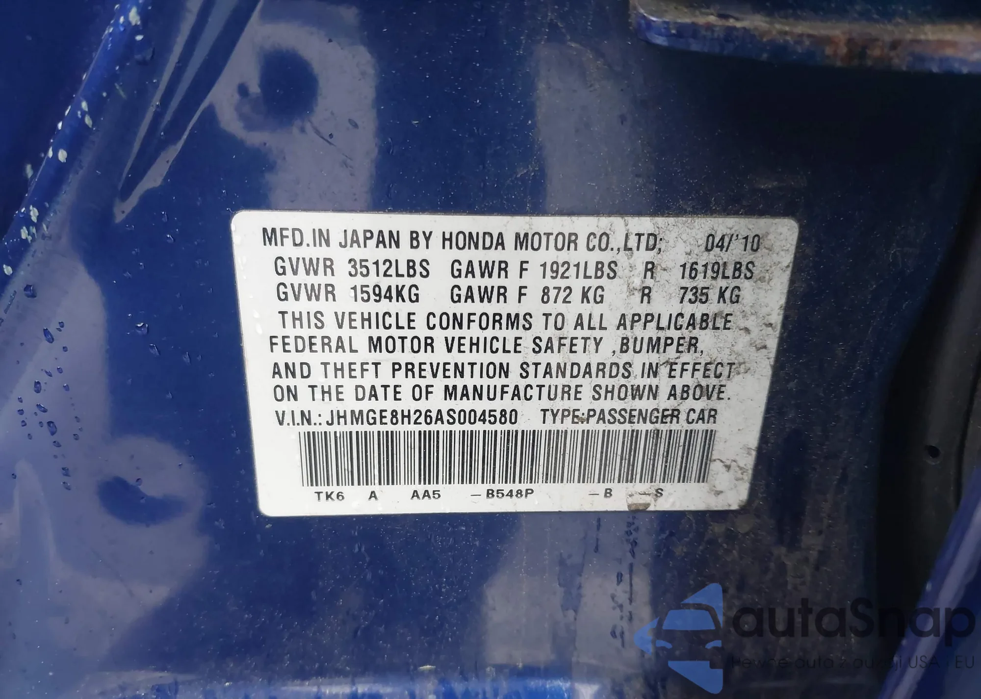 VIN: JHMGE8H26AS004580