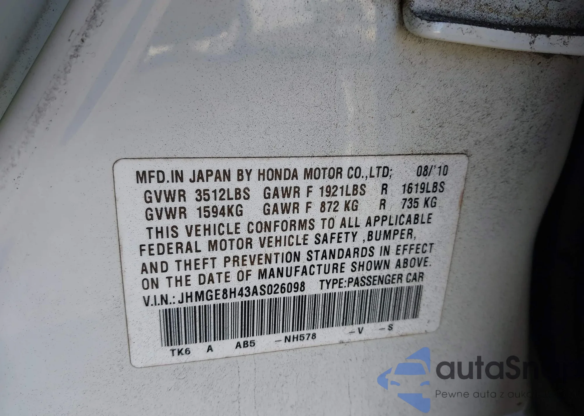 VIN: JHMGE8H43AS026098