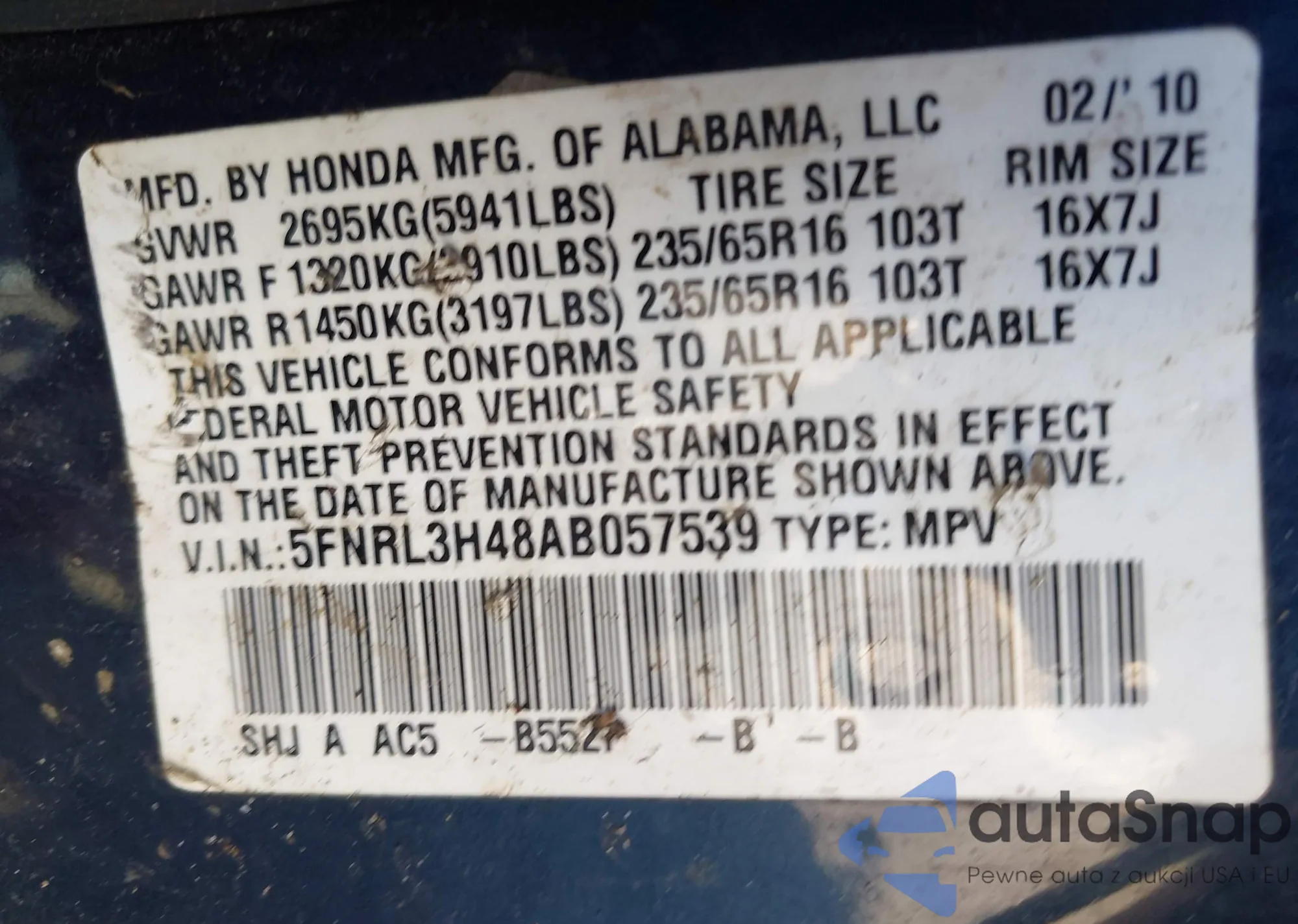 • VIN: 5FNRL3H48AB057539