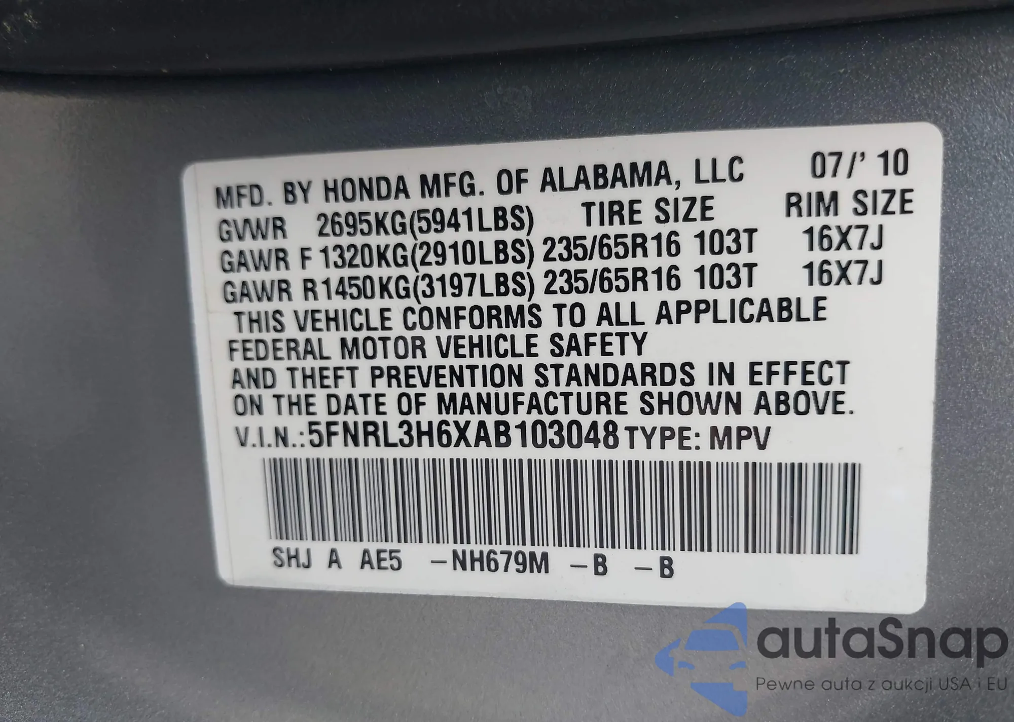 VIN: 5FNRL3H6XAB103048