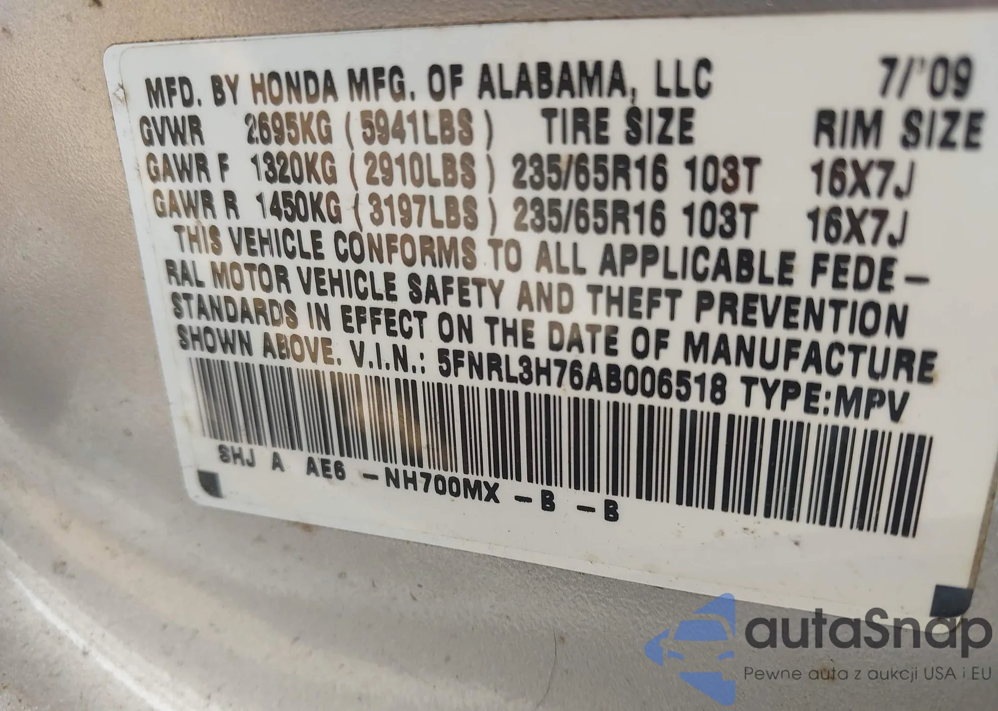 VIN: 5FNRL3H76AB006518