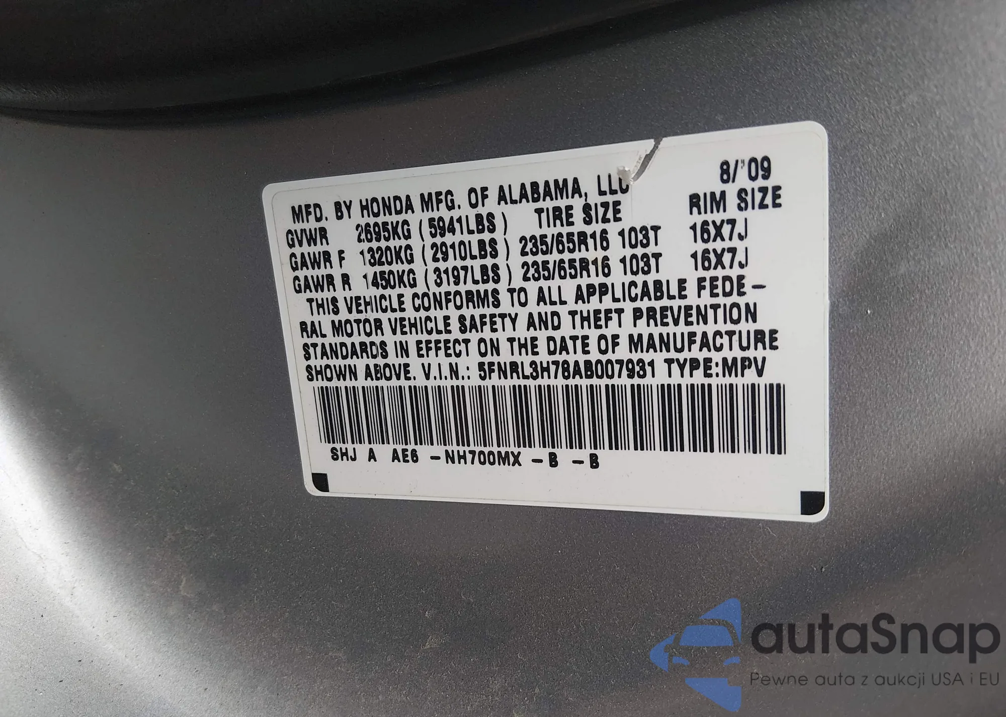 The car Honda Odyssey 2010 (VIN 5FNRL3H78AB007931) is sold by an unverified seller. We recommend checking the Carfax report and confirming registration possibilities before purchase.