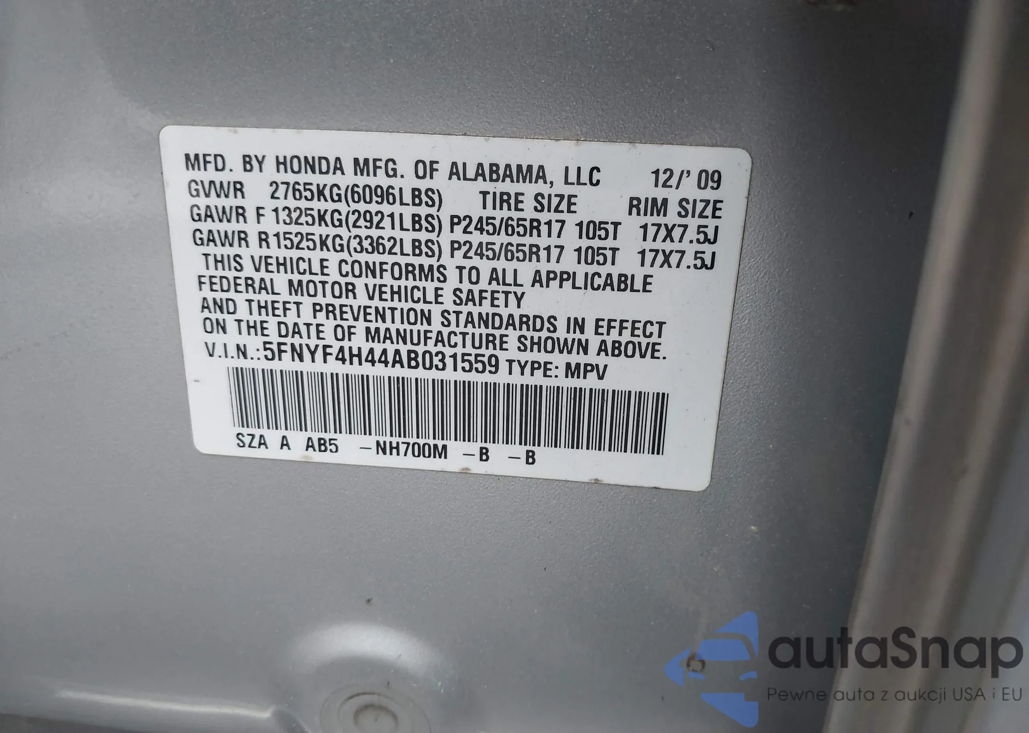 VIN: 5FNYF4H44AB031559