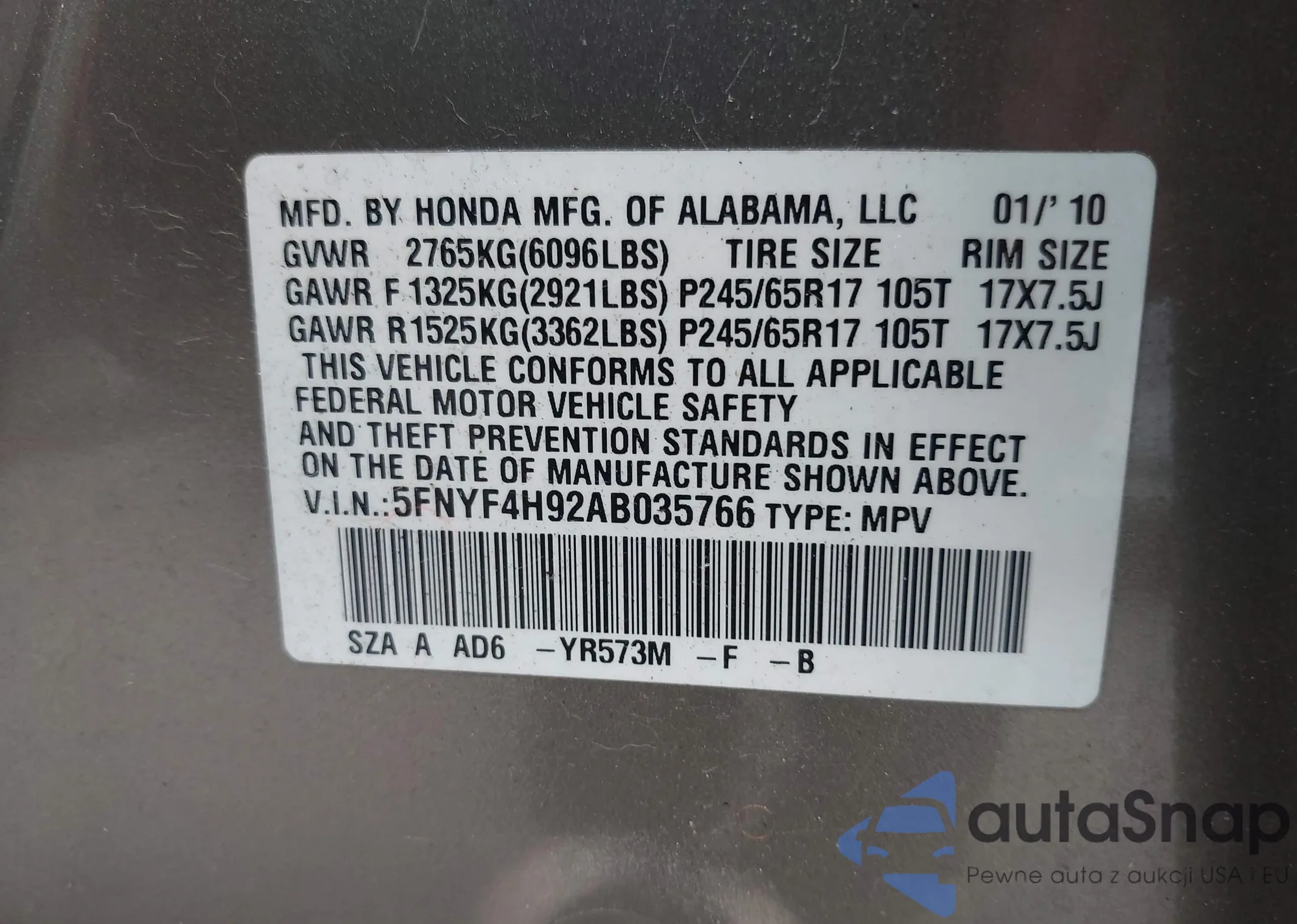 VIN: 5FNYF4H92AB035766