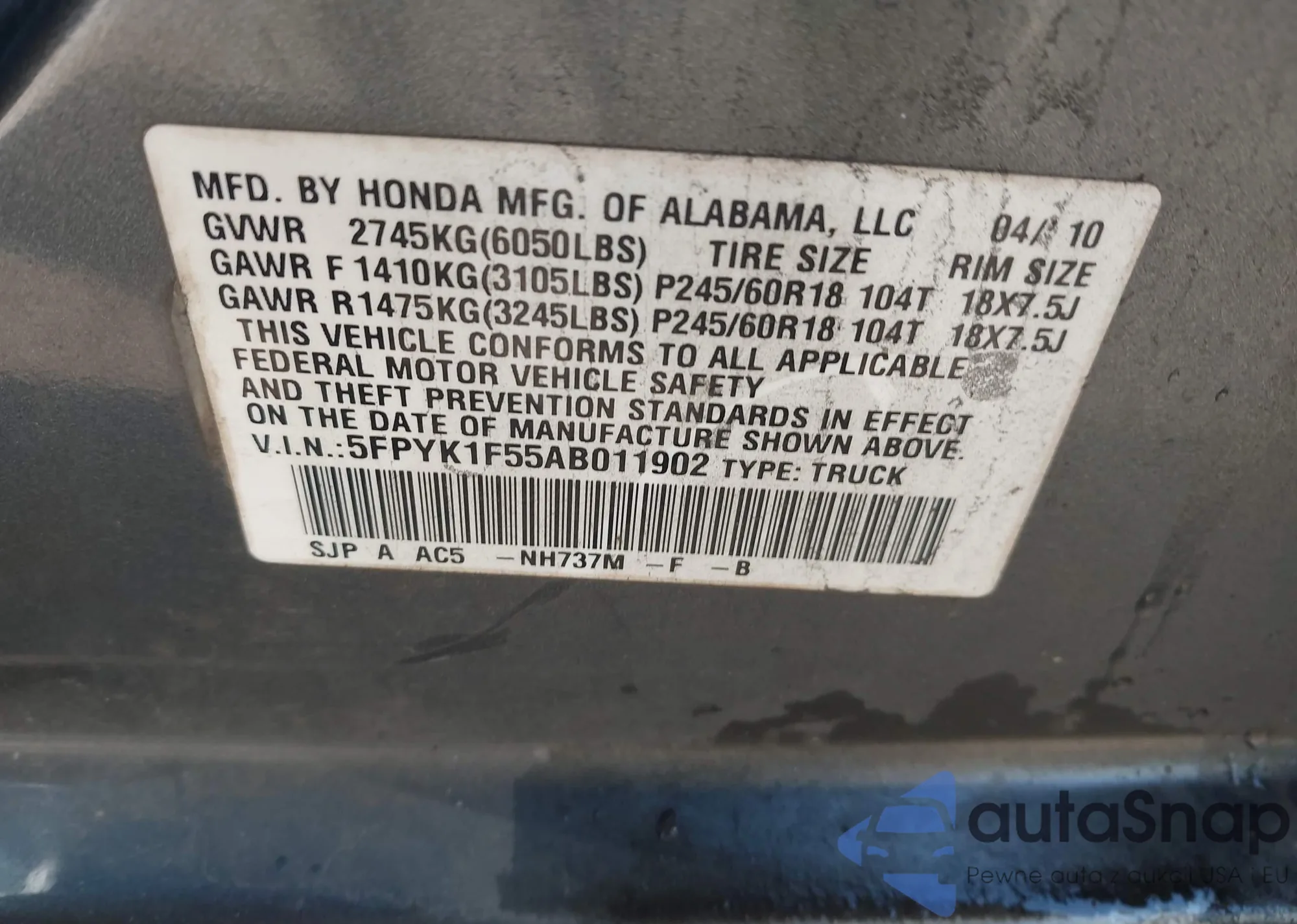 VIN: 5FPYK1F55AB011902