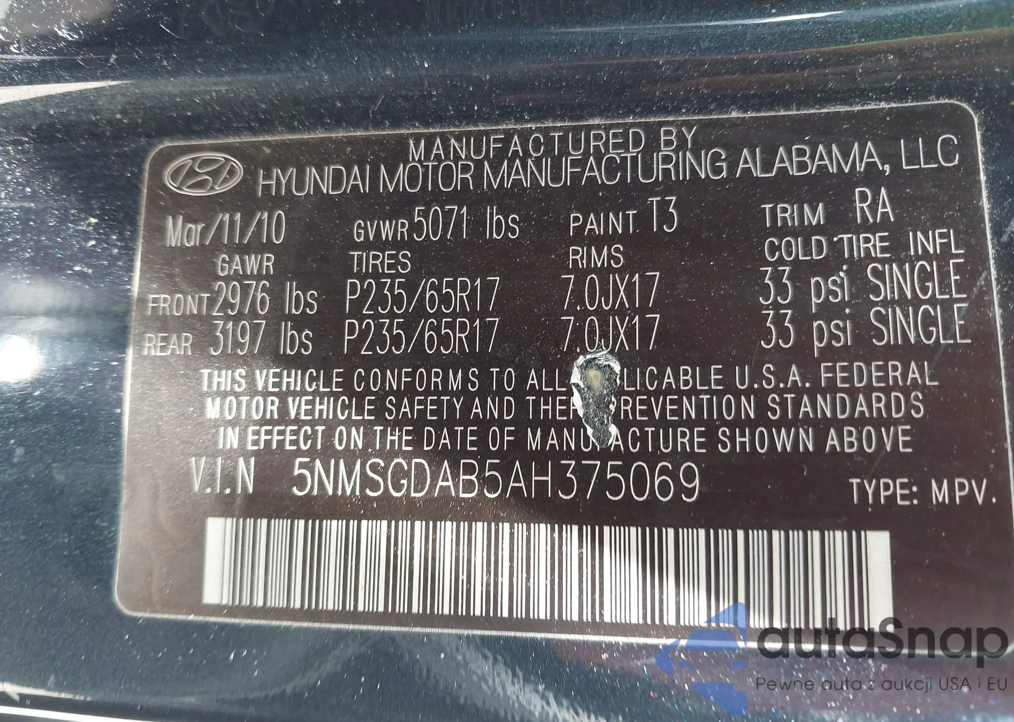 VIN: 5NMSGDAB5AH375069