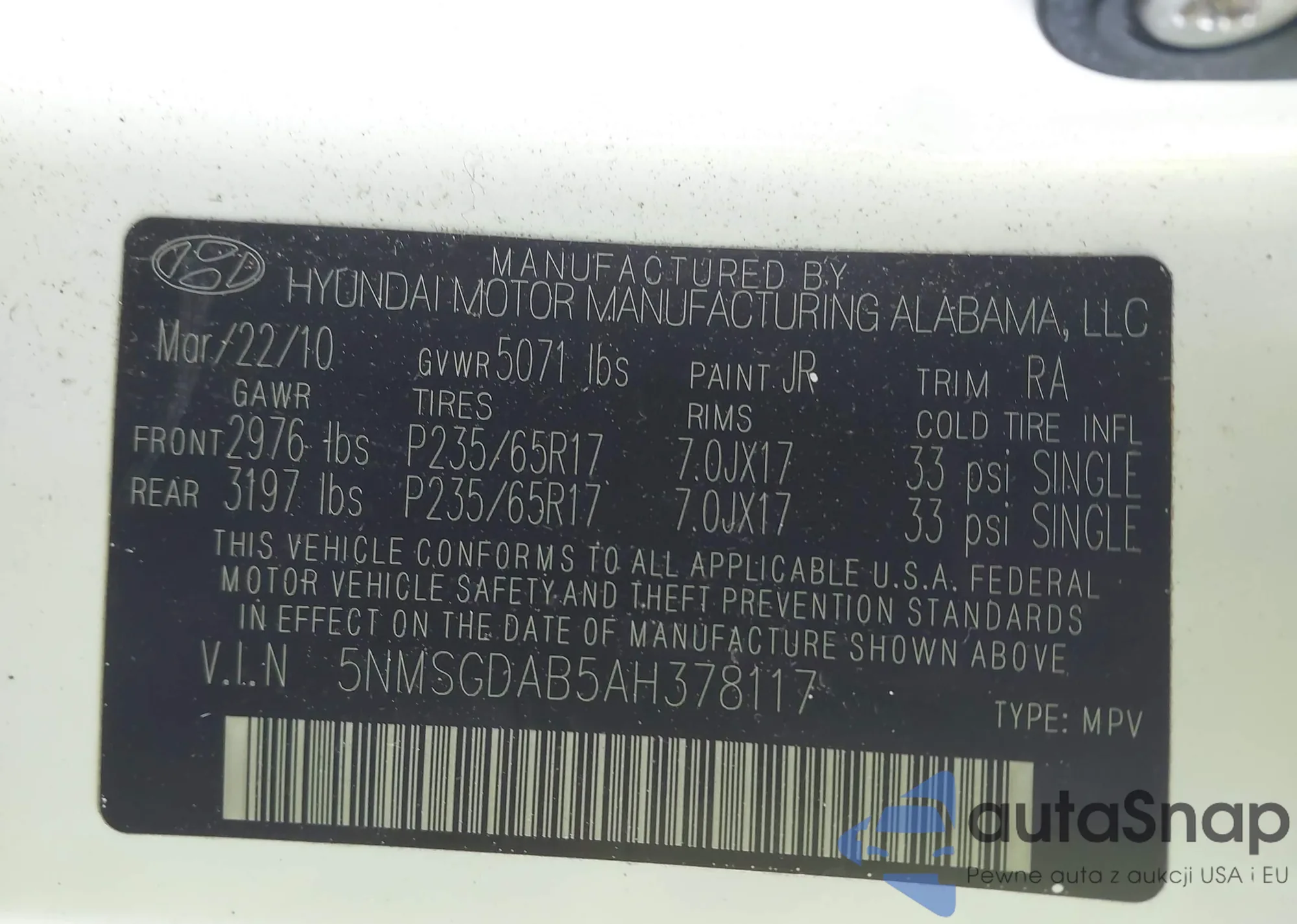 VIN: 5NMSGDAB5AH378117