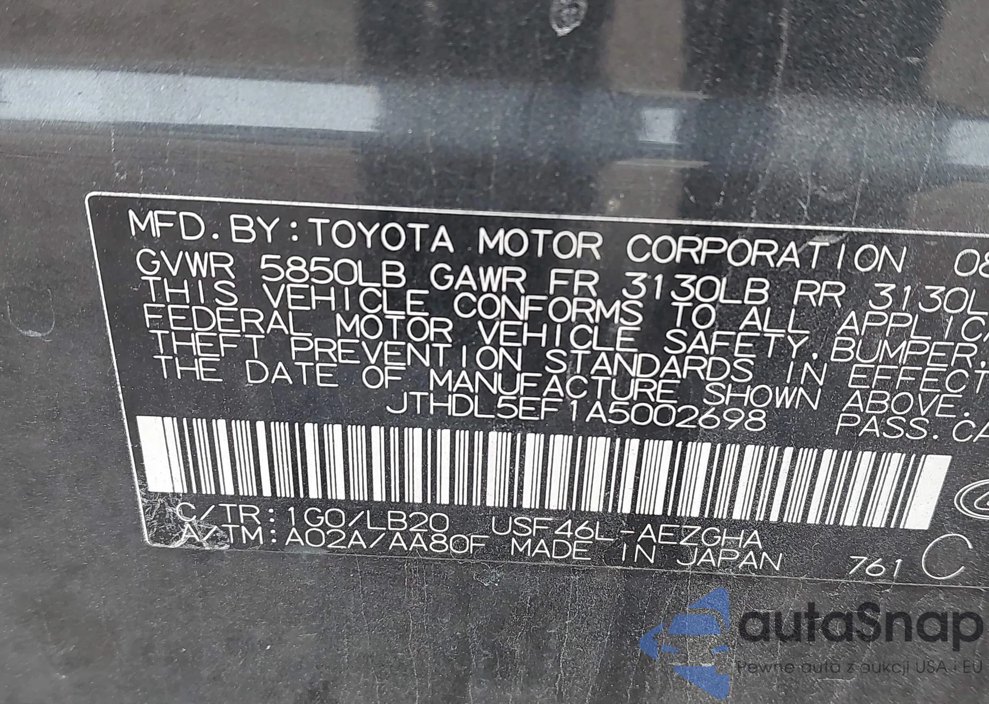 • VIN: JTHDL5EF1A5002698