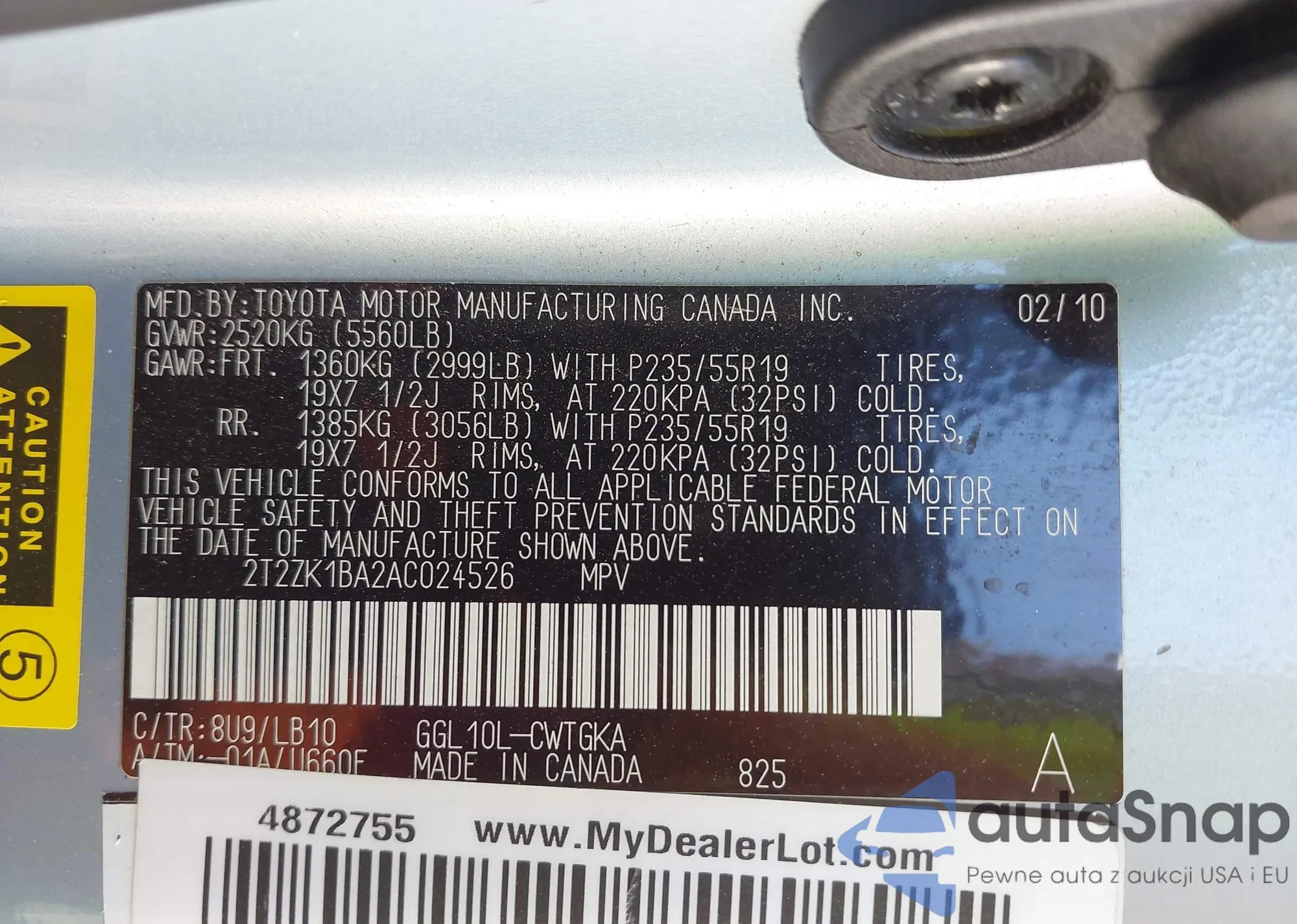 VIN: 2T2ZK1BA2AC024526