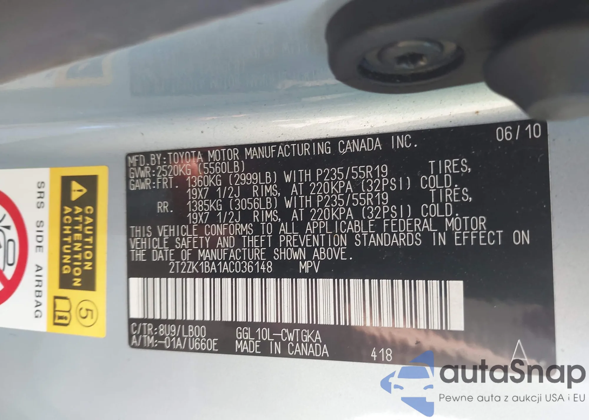 VIN: 2T2ZK1BA1AC036148