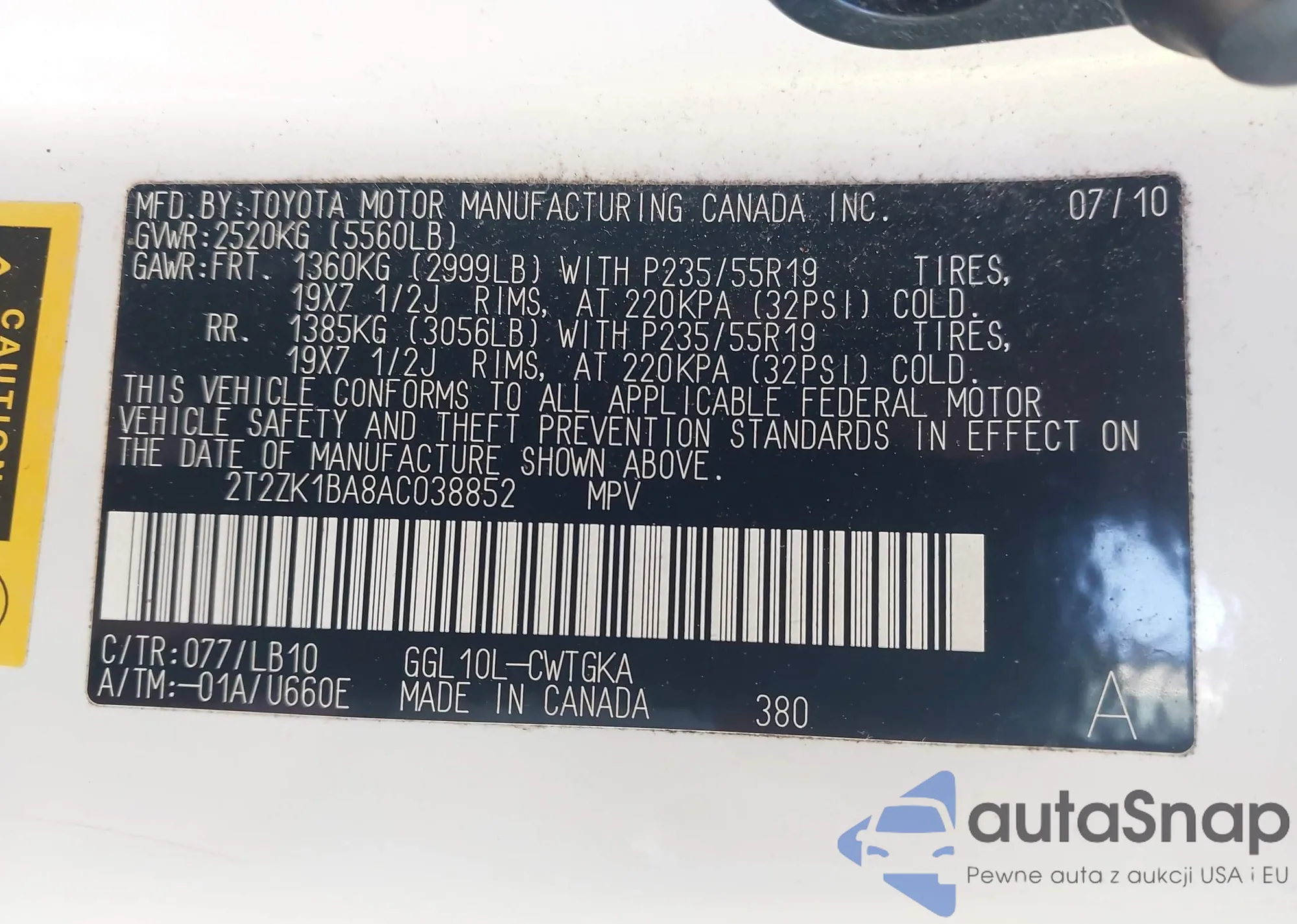 VIN: 2T2ZK1BA8AC038852