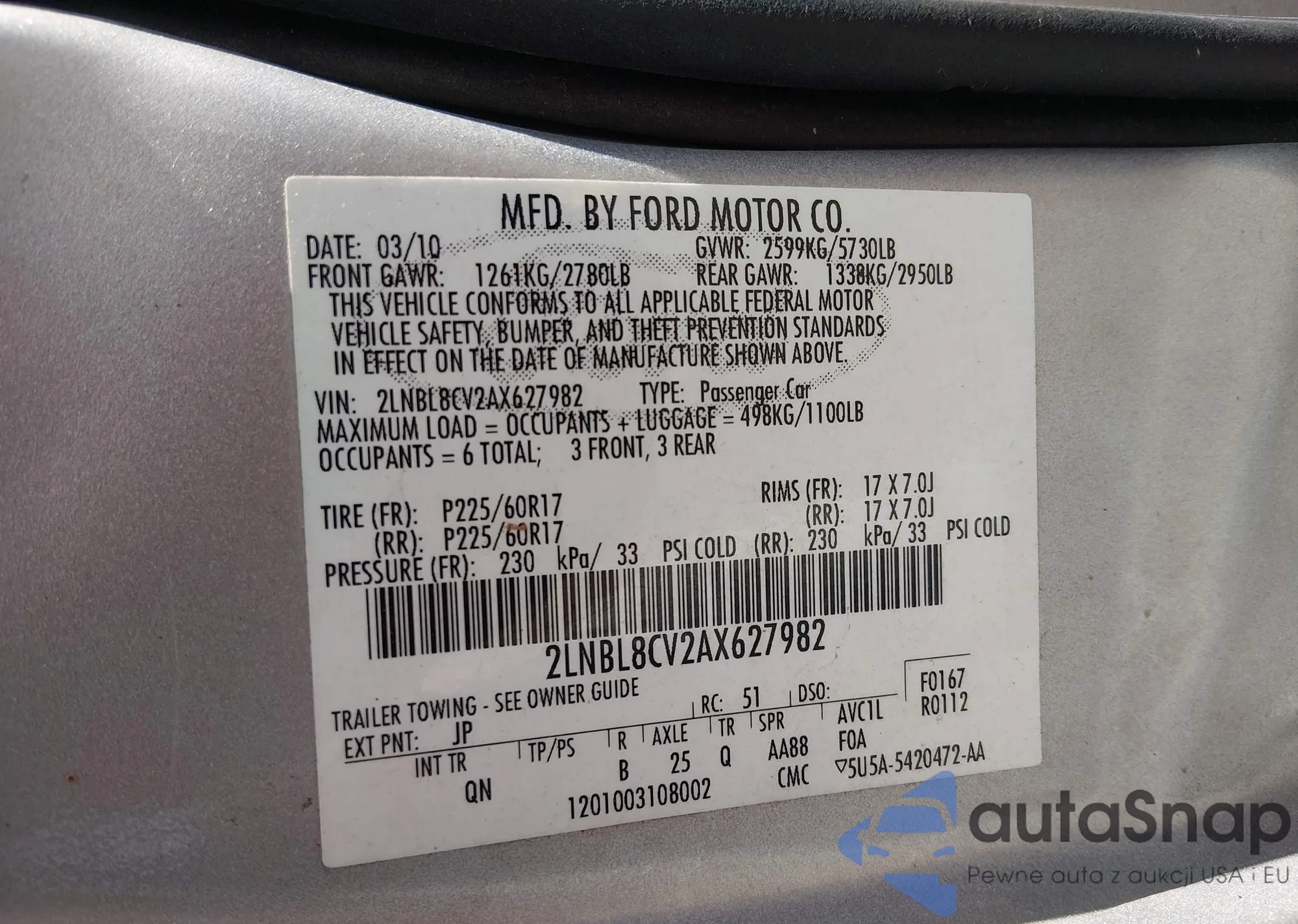 • VIN: 2LNBL8CV2AX627982