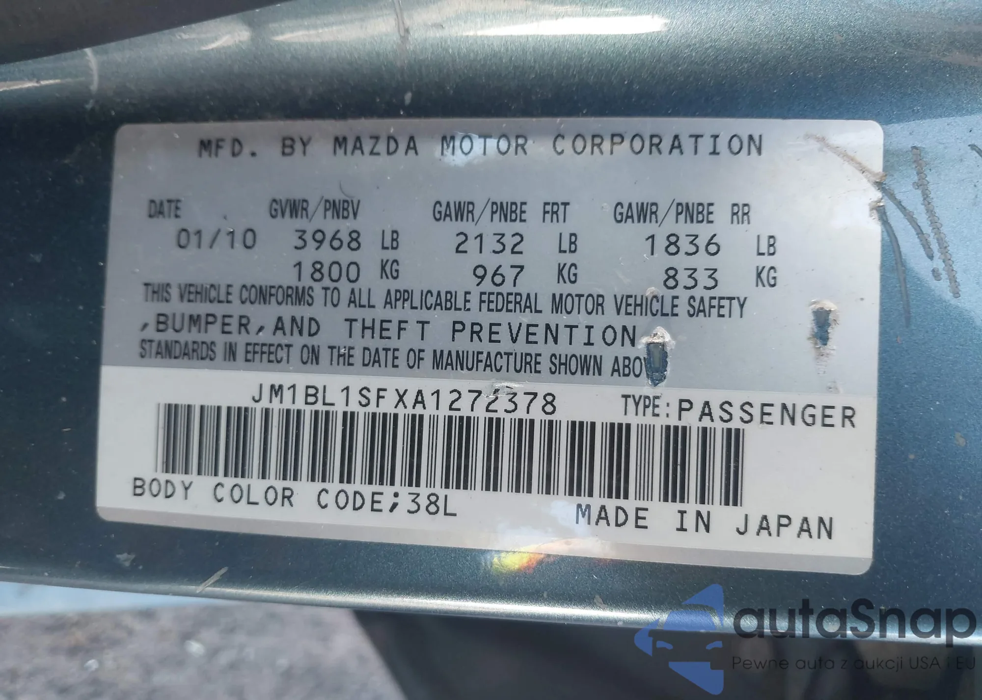 The car Mazda 3 2010 (VIN JM1BL1SFXA1272378) has not been auctioned before. The documents are clean, and the mileage matches or is below the market average. Sold by an insurance company – we recommend purchase. Delivery to the port will take approx. 6–8 weeks.