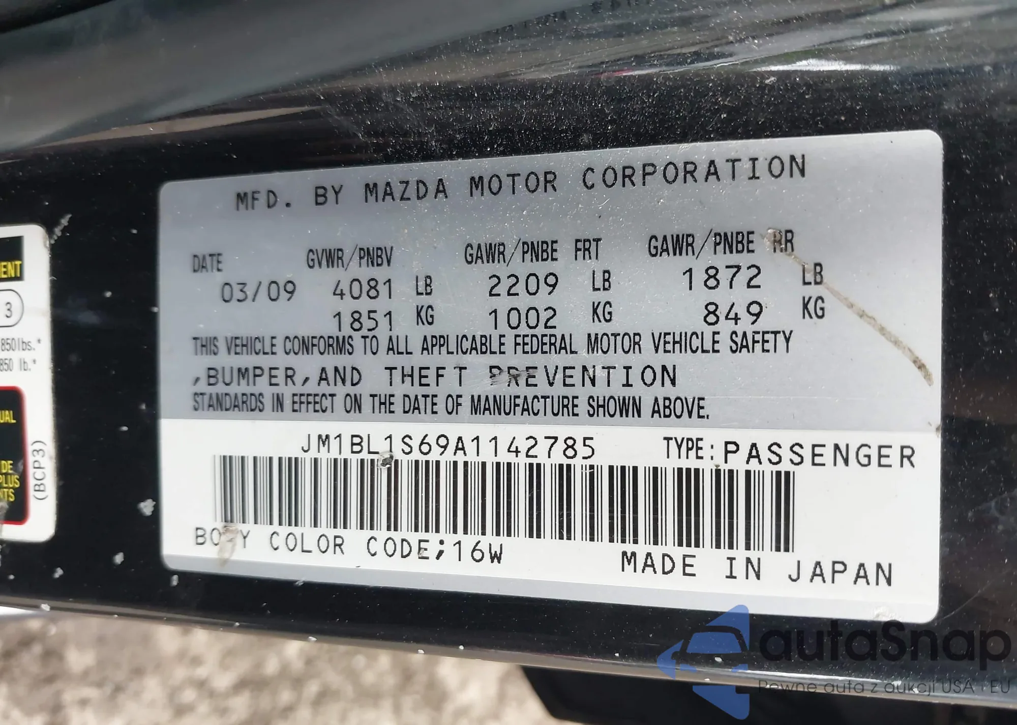 The car Mazda 3 2010 (VIN JM1BL1S69A1142785) has not been auctioned before. The documents are clean, and the mileage matches or is below the market average. Sold by an insurance company – we recommend purchase. Delivery to the port will take approx. 6–8 weeks.
