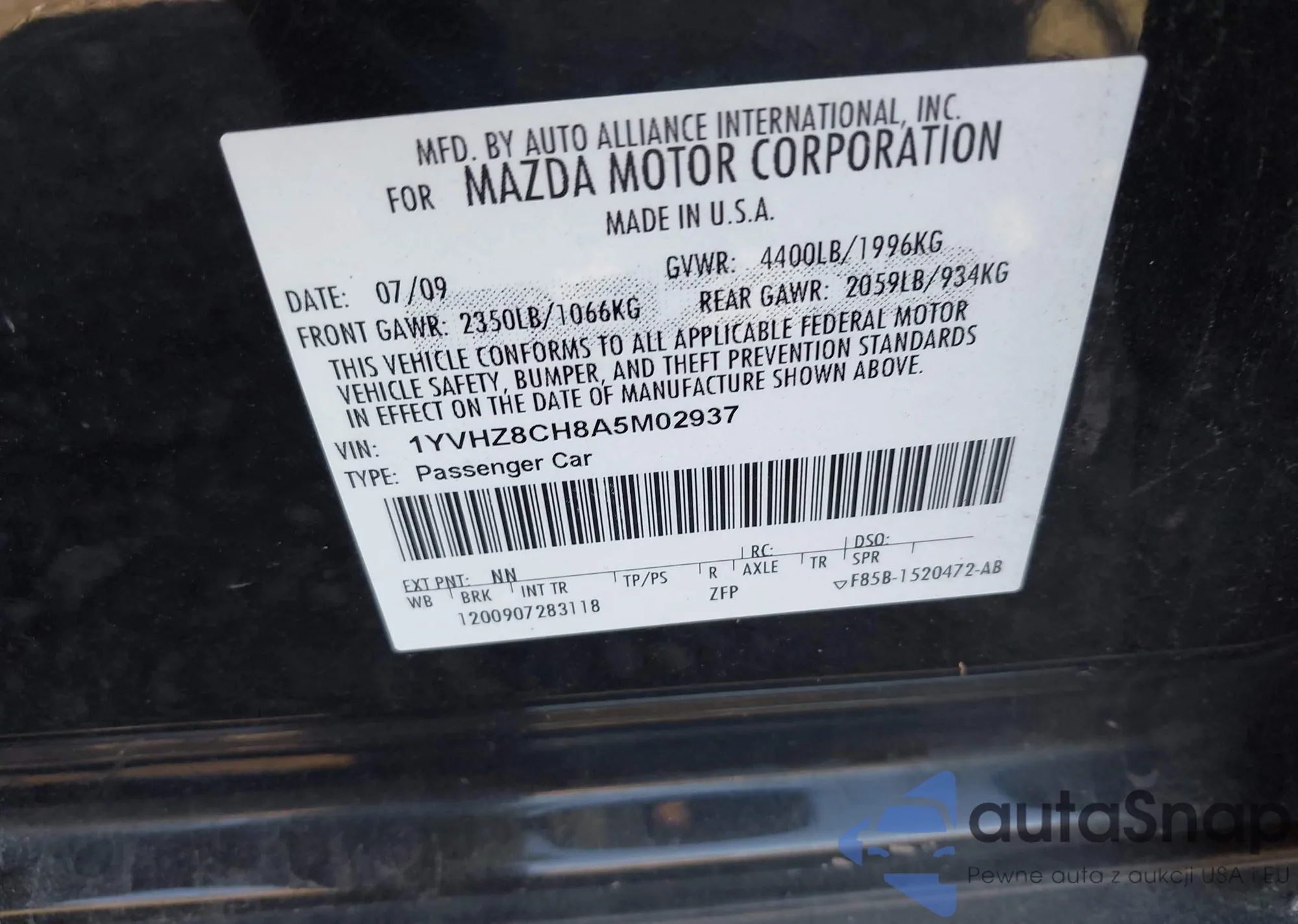 The car Mazda 6 2010 (VIN 1YVHZ8CH8A5M02937) has documents that prevent registration. Export and registration may be difficult. Contact AutaSnap experts to find alternatives.