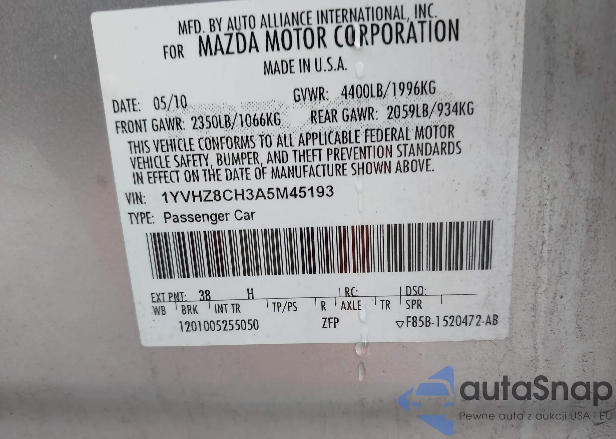 VIN: 1YVHZ8CH3A5M45193