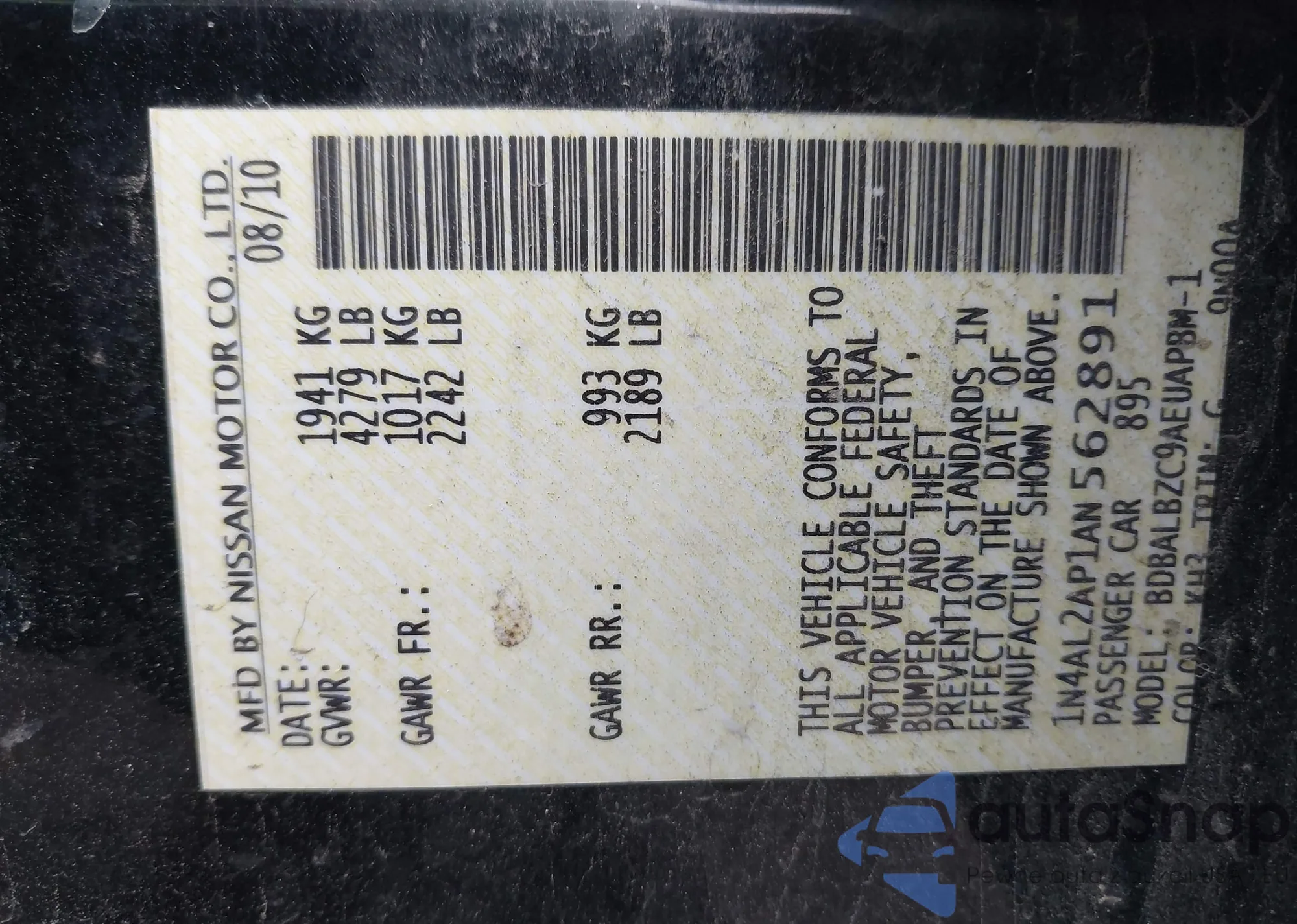 The car Nissan Altima 2010 (VIN 1N4AL2AP1AN562891) has not been auctioned before. The documents are clean, and the mileage matches or is below the market average. Sold by an insurance company – we recommend purchase. Delivery to the port will take approx. 6–8 weeks.
