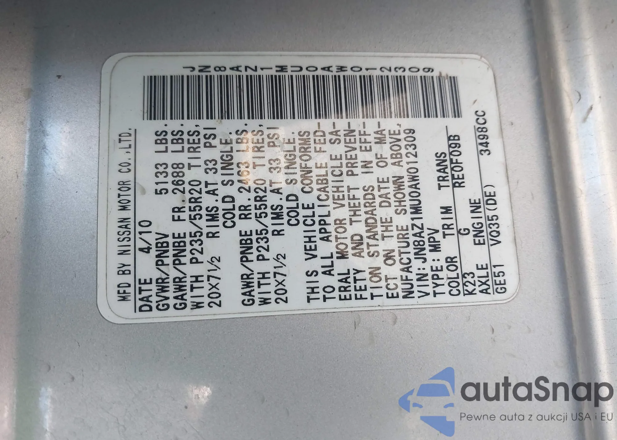 VIN: JN8AZ1MU0AW012309