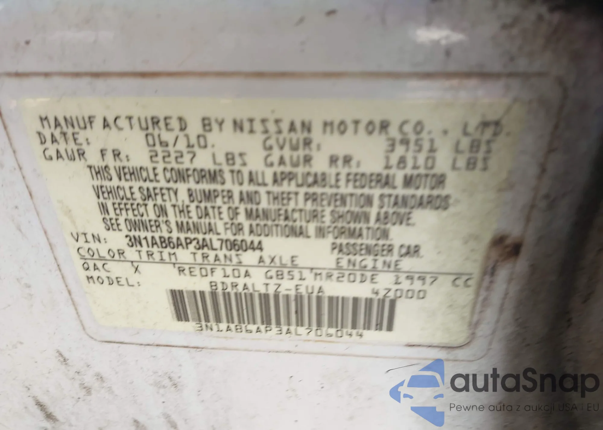 The car Nissan Sentra 2010 (VIN 3N1AB6AP3AL706044) is sold by an unverified seller. We recommend checking the Carfax report and confirming registration possibilities before purchase.