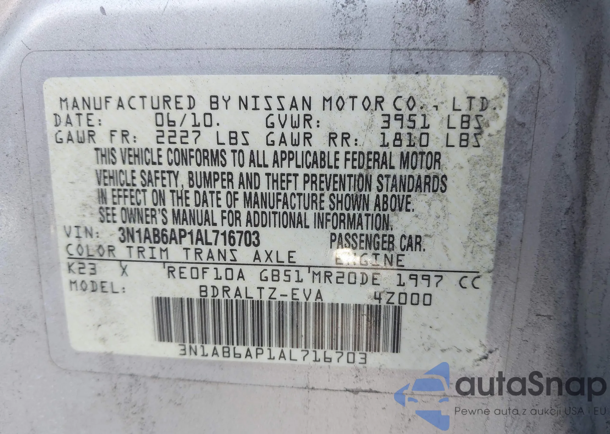 The car Nissan Sentra 2010 (VIN 3N1AB6AP1AL716703) has not been auctioned before. The documents are clean, and the mileage matches or is below the market average. Sold by an insurance company – we recommend purchase. Delivery to the port will take approx. 6–8 weeks.