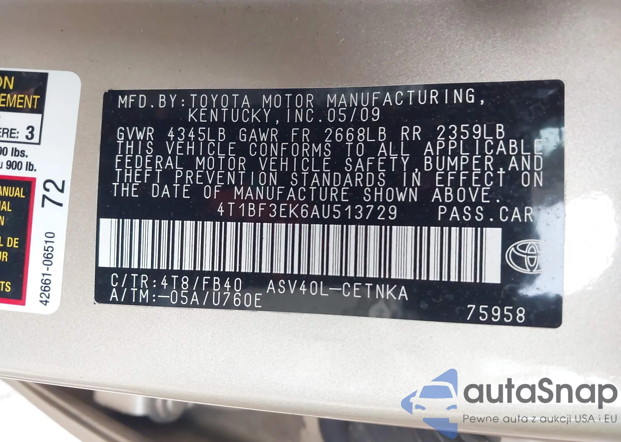 VIN: 4T1BF3EK6AU513729